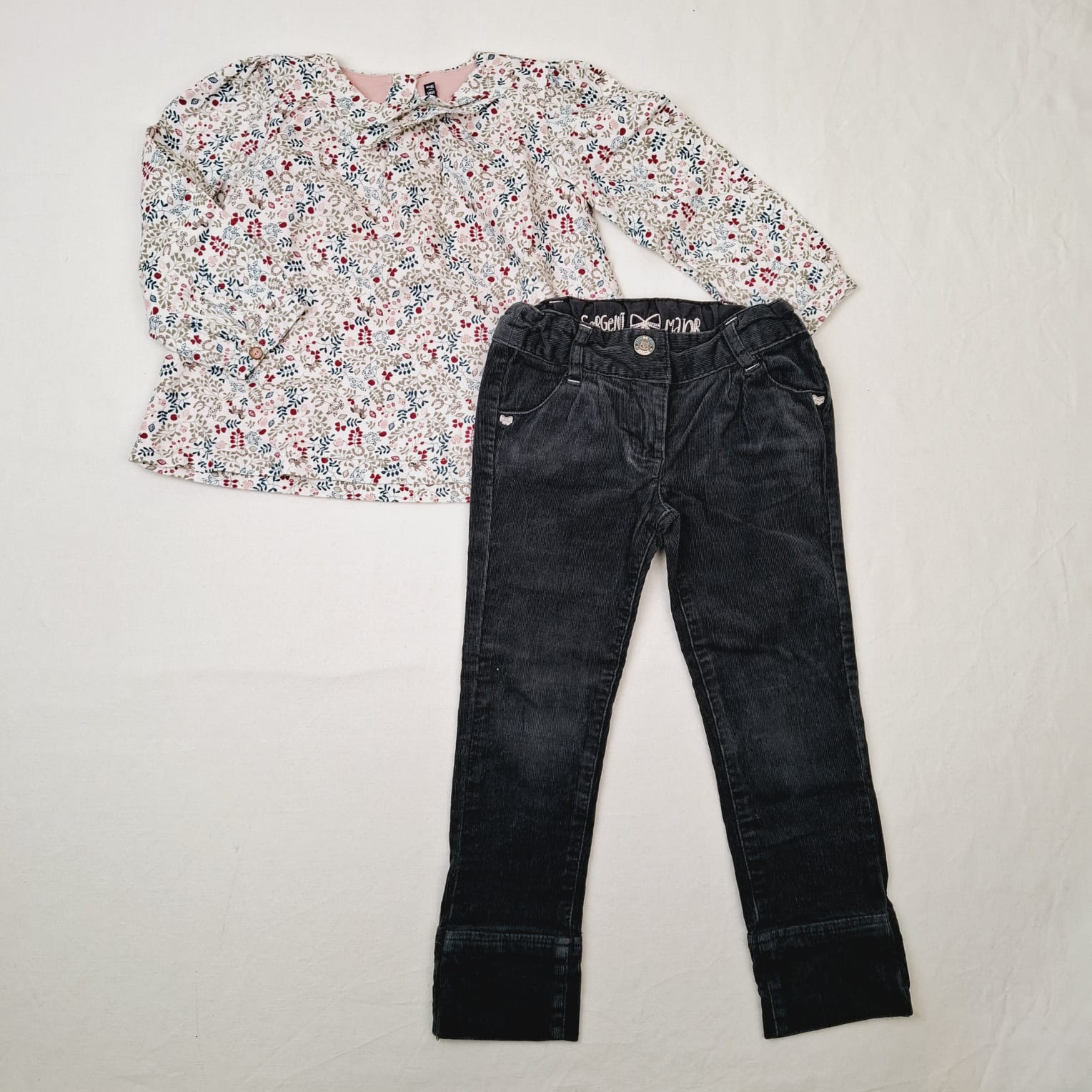 Autres commentaires : Ensemble 2 pièces : – Blouse manches longues blanc cassé, imprimé fleuri rose framboise, vert canard et vert-gris, col collerette, doublure unie rose, fermeture en haut du dos et des poignets par boutons, 100% coton. – Pantalon en velours côtelé gris foncé, ceinture ajustable par élastique intérieur, fermeture devant par zip et boutons pression, empiècement au niveau des chevilles, 99% coton et 1% élasthanne.