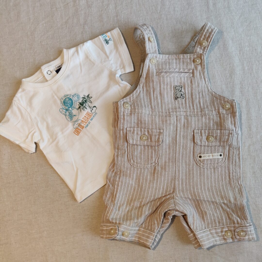 Autres commentaires : Salopette 55% lin beige et écrue à rayures. Petit ours brodé sur le torse. Fermeture par 2 niveaux de boutons aux bretelles, boutons sur les côtés et boutons pression à l’entrejambe. T-shirt manches courtes écru, dessin d’île avec tampons de timbres postaux, inscription « coin de paradis ». Fermeture par boutons pression tout le long du dos.