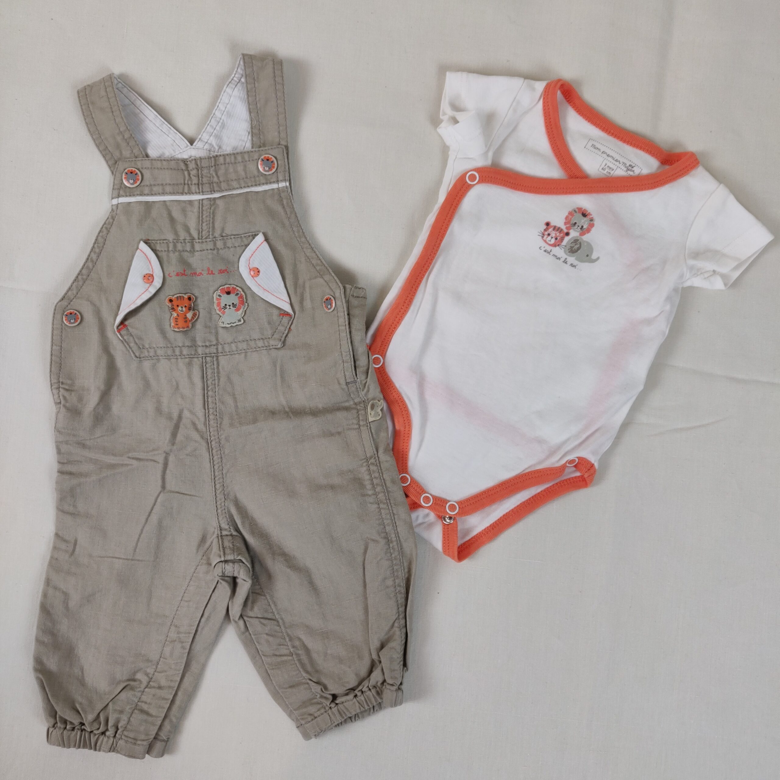 Autres commentaires : Salopette 46% coton, beige avec tigre et lion couleur pèche. Fermeture bretelle, côté et entrejambes par boutons pression. Body manches courtes coeur croisé assorti.
