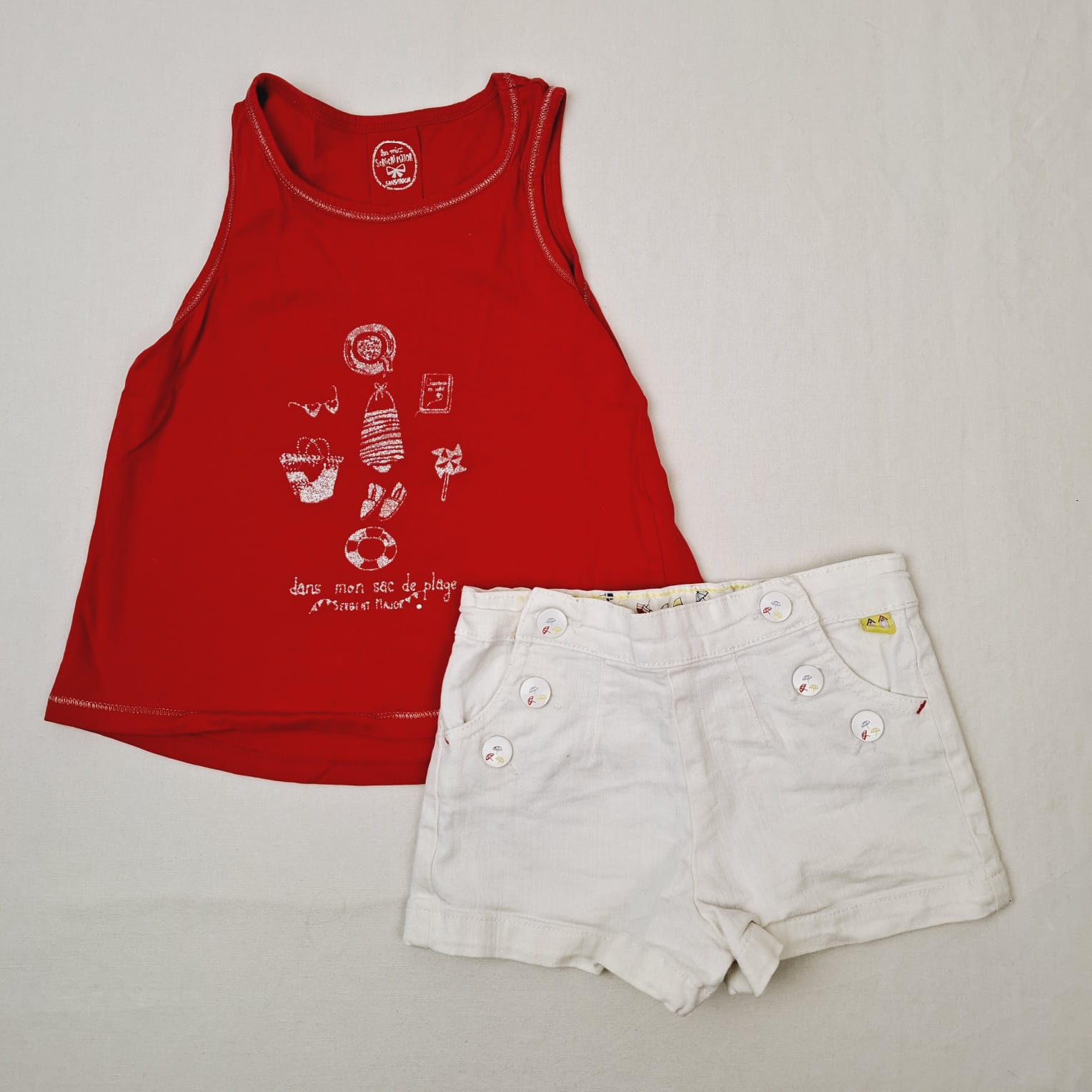Autres commentaires : Ensemble 2 pièces : – T-shirt sans manches rouge, devant motifs accessoires de plage de couleur argentée, surpiqûres argentées, col arrondi. – Short court en toile écru, style pont, fermeture devant par boutons pression, ceinture ajustable par élastique intérieur, 98% coton et 2% élasthanne.
