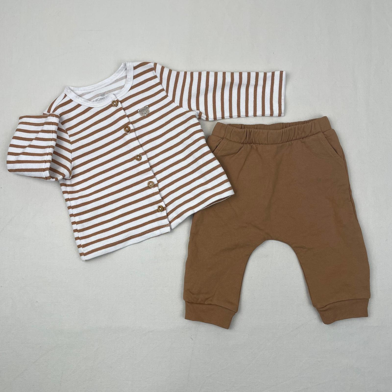 Autres commentaires : Ensemble 2 pièces assorties : – Gilet côtelé blanc à rayures couleur caramel, col rond, fermeture devant par petits boutons. – Pantalon uni couleur caramel, effet un peu molletonné à l’intérieur, taille élastiquée, chevilles en bord côte.