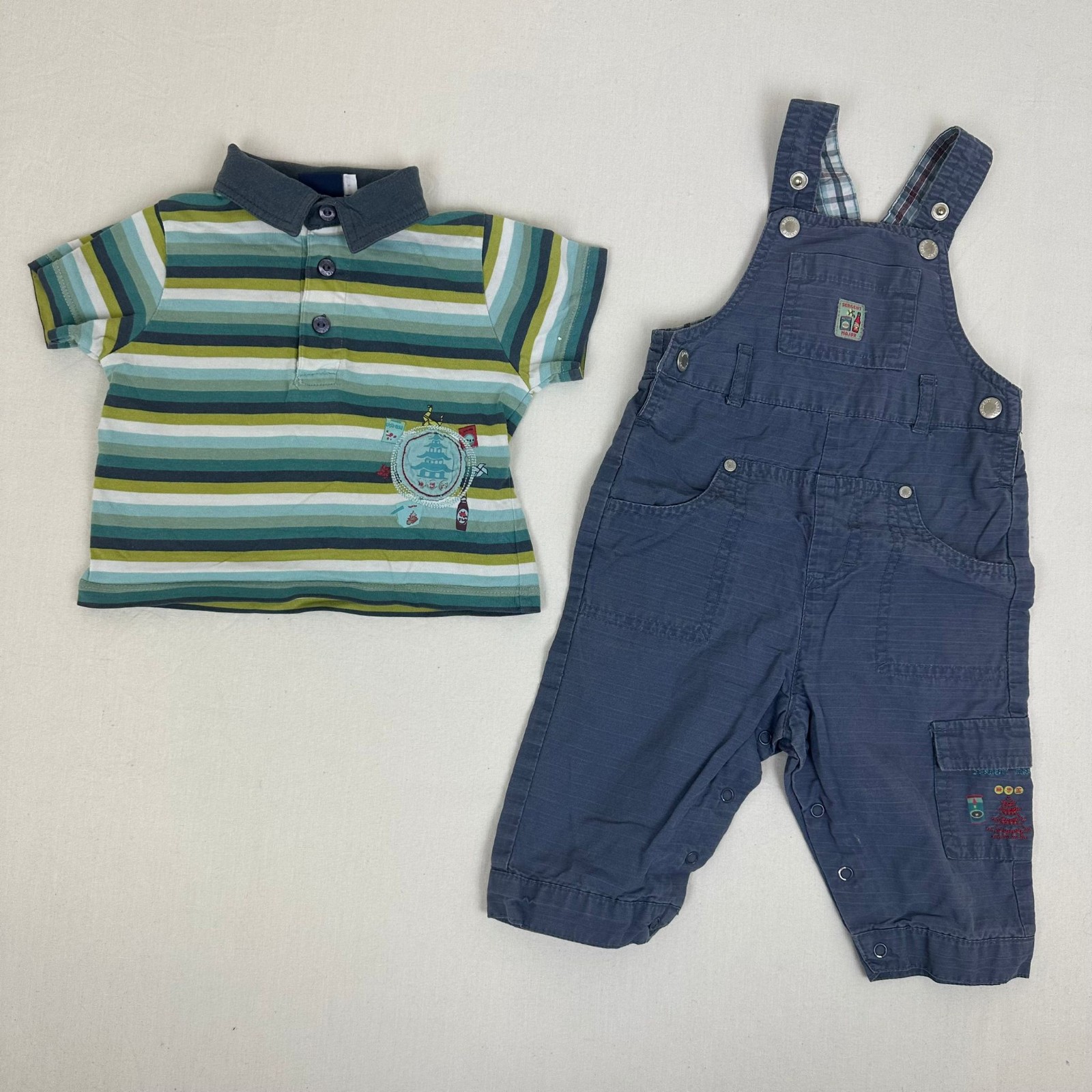 Autres commentaires : Polo manches courtes vert avec rayures orange,blanc,gris et blanc. Salopette bleu foncé, 2 poches latérales et une double fermeture par boutons pressions au niveau de la taille.