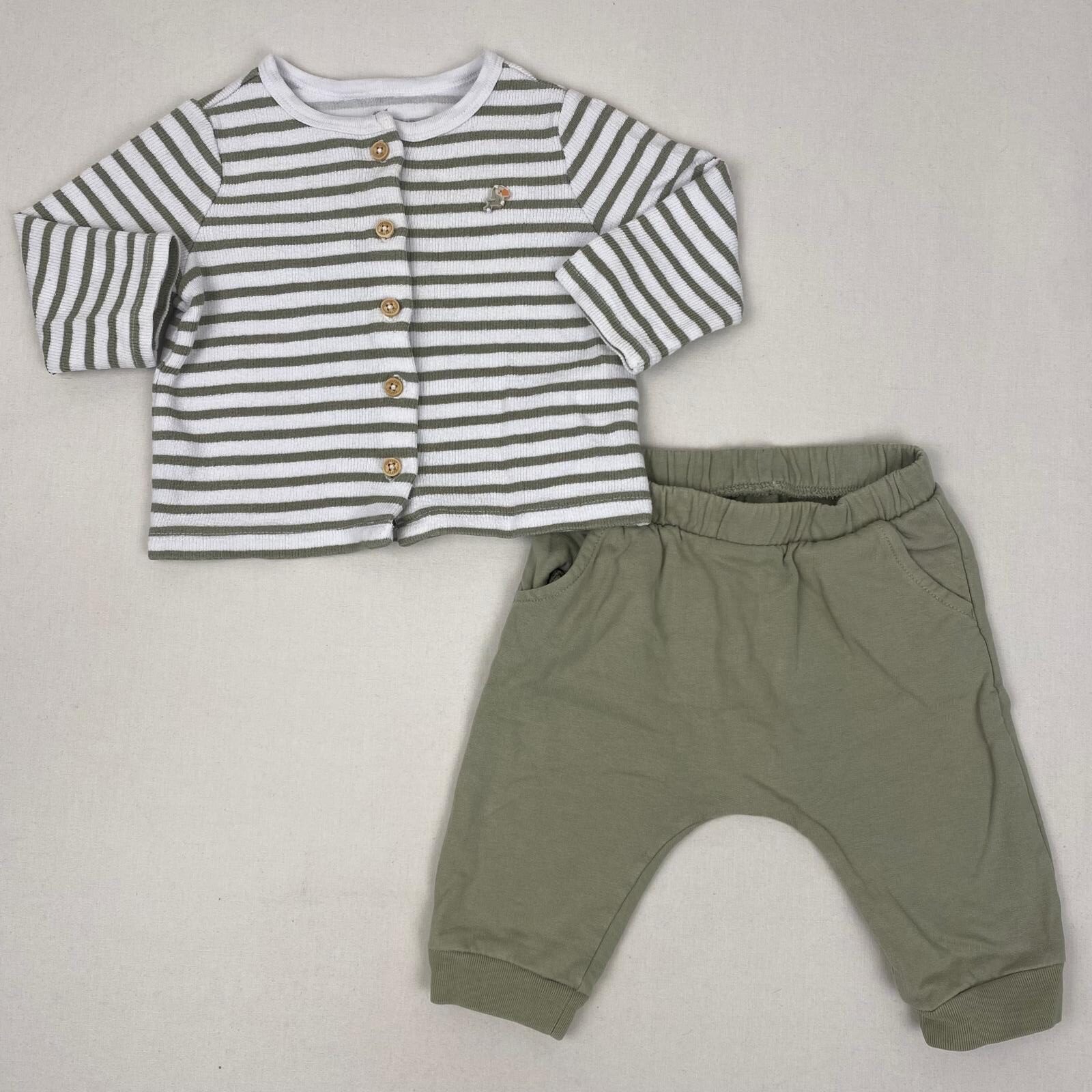 Autres commentaires : Ensemble 2 pièces : – Un pantalon vert, taille et cheville élastique, – Un gilet à manches longues blanc avec des rayures vertes, fermeture par boutons