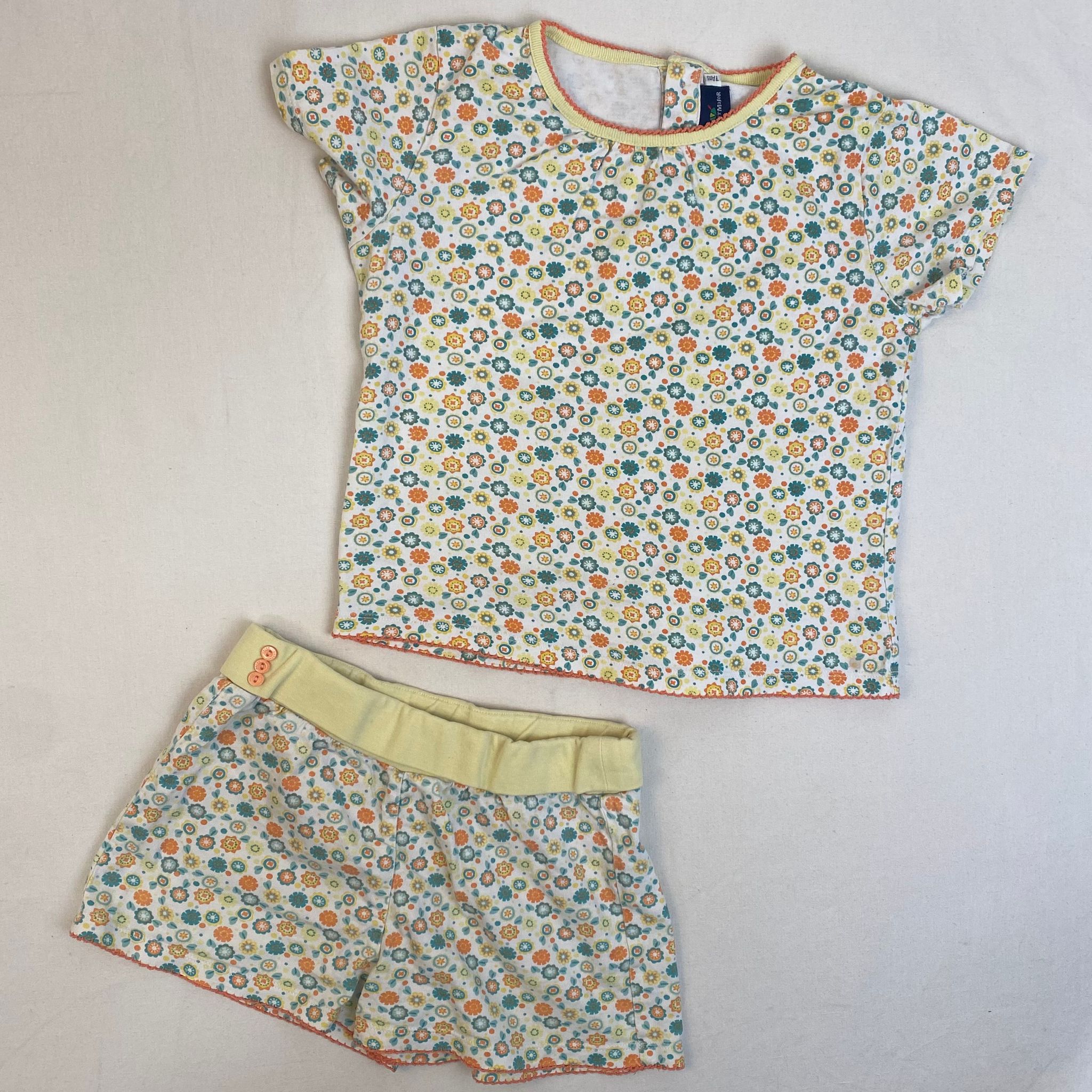 Ensemble 2 pièces blanc parsemé de fleurs jaunes orange, et vertes : – T-shirt manches courtes, col rond jaune et bas avec liseré dentelé orange, fermeture en haut du dos par petits boutons orange. – Short assorti avec large ceinture jaune élastiquée, devant petits boutons orange décoratifs.