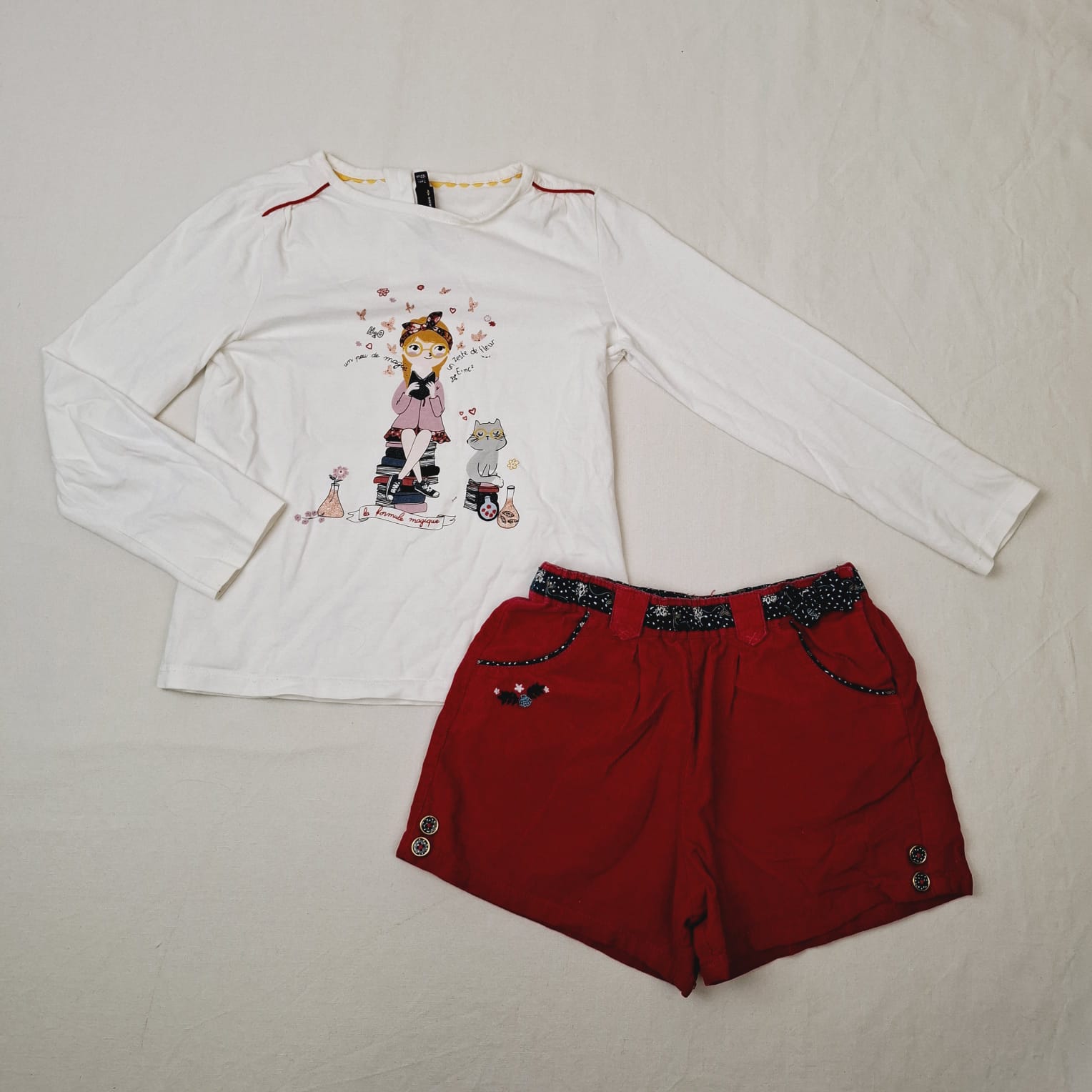 Autres commentaires : Ensemble 2 pièces : – T-shirt manches longues blanc écru, devant motif jeune fille lectrice avec chat à lunettes et des fioles de potions, inscription « La formule magique » « H2O » « un zeste de fleurs », » un peu de magie », col arrondi, fermeture en haut du dos par boutons. – Short en velours côtelé rose fuchsia, mini coquillage eet feuillage en broderie bleue et blanche, ceinture ajustable par élastique intérieur, effet ceinture en tissu bleu marine avec des mini poissons et algues en motifs, noeud décoratif devant, fermeture latérale par boutons pression, 100% coton.