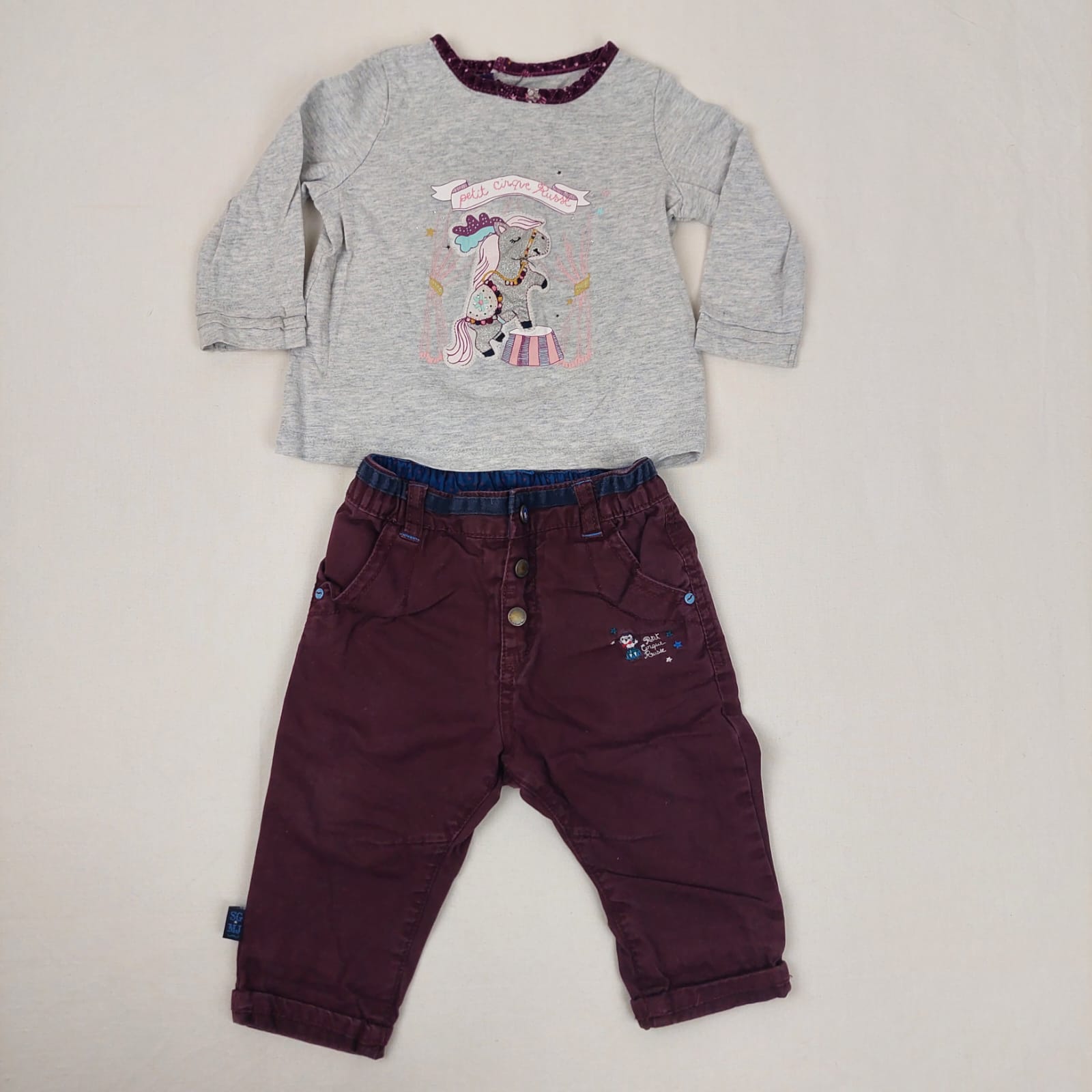 Autres commentaires : Thème « Petit cirque Russe ». T-shirt manches longues gris avec licorne fermé par boutons pression tout le long du dos ; pantalon bordeaux doublé (42% polyester) mixte, taille élastiquée et fermeture par boutons pression.