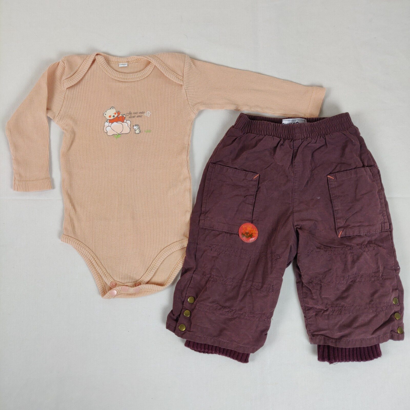 Autres commentaires : 37% polyester. Ensemble 2 pièces. Pantalon doublé – prune avec écusson rouge sur la poche représentant un oiseau noir et inscription « Abracadabra ». Taille élastique. La doublure se terminant par un tissu façon tricot dépasse du pantalon. Ouverture latérale aux jambes à 3 boutons pression. 2 poches latérales et une poche arrière en trompe-l’oeil. Motif oiseau orange et potion magique à l’arrière. Body manches longues sans marque – saumon à motif ourson se prélassant dans une fleur avec inscirption « Je suis née dans une fleur ». Ouverture à l’entrejambe à 3 boutons pression.