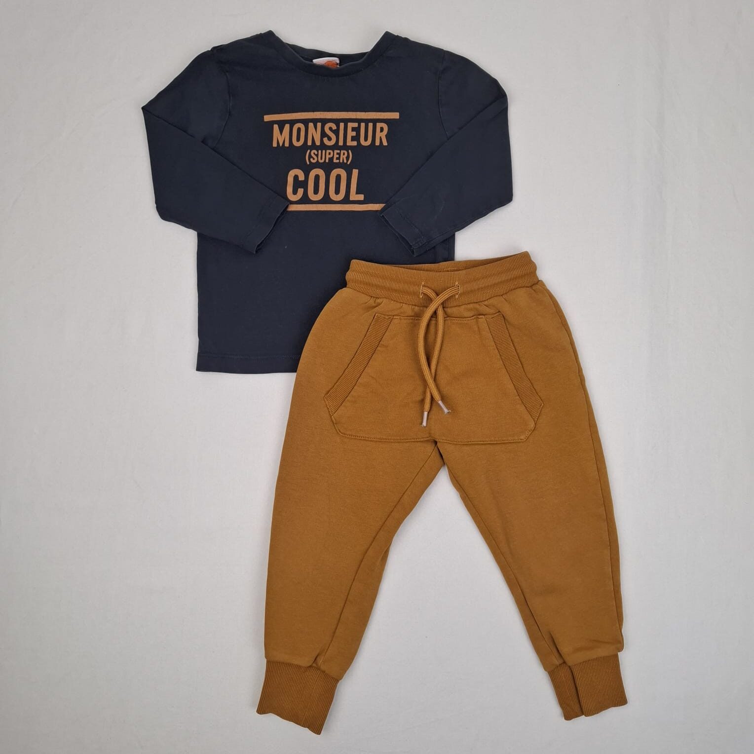 Autres commentaires : Ensemble 2 pièces Tape à l’oeil: – T-shirt bleu foncé, manches longues, col rond, inscription « Monsieur ( super) Cool » floqué à l’avant du vêtement. Pantalon de jogging, jaune moutarde, poxhes cconnecté, taille élastiquée, cordon our régler la taille.