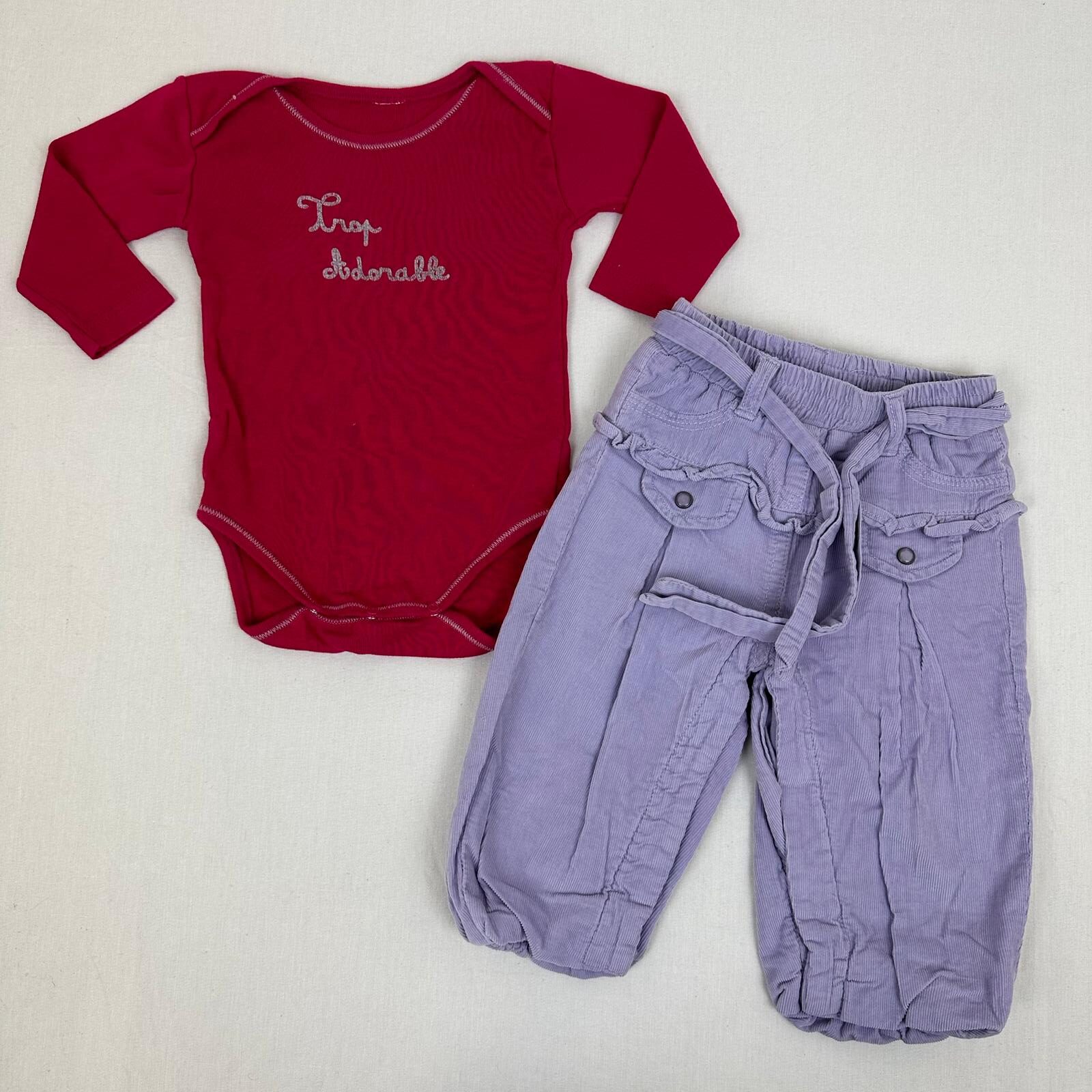 Autres commentaires : Pantalon Tape à l’oeil parachute lilas avec taille élastiquée et avec cordon et une fermeture par boutons pressions au niveau des jambes. Body manches longues rose fuscia sans marque.