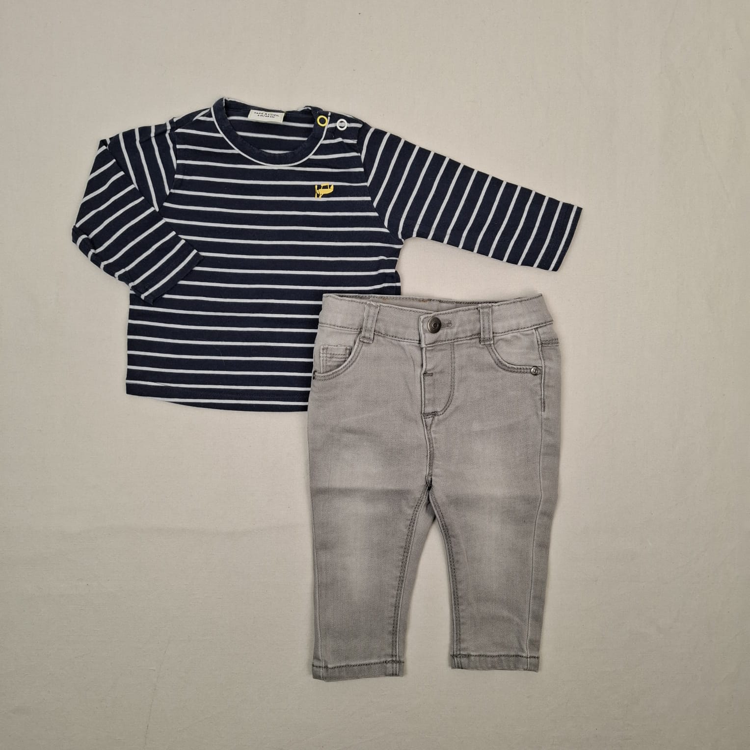 Autres commentaires : Ensemble 2 pièces : – Pantalon en jean gris clair, taille ajustable par élastique intérieur, fermeture devant par un bouton pression. – T-shirt marinière manches longues, bleu à rayures blanches, devant motif mini avion vintage jaune, fermeture par boutons pression à l’épaule gauche.