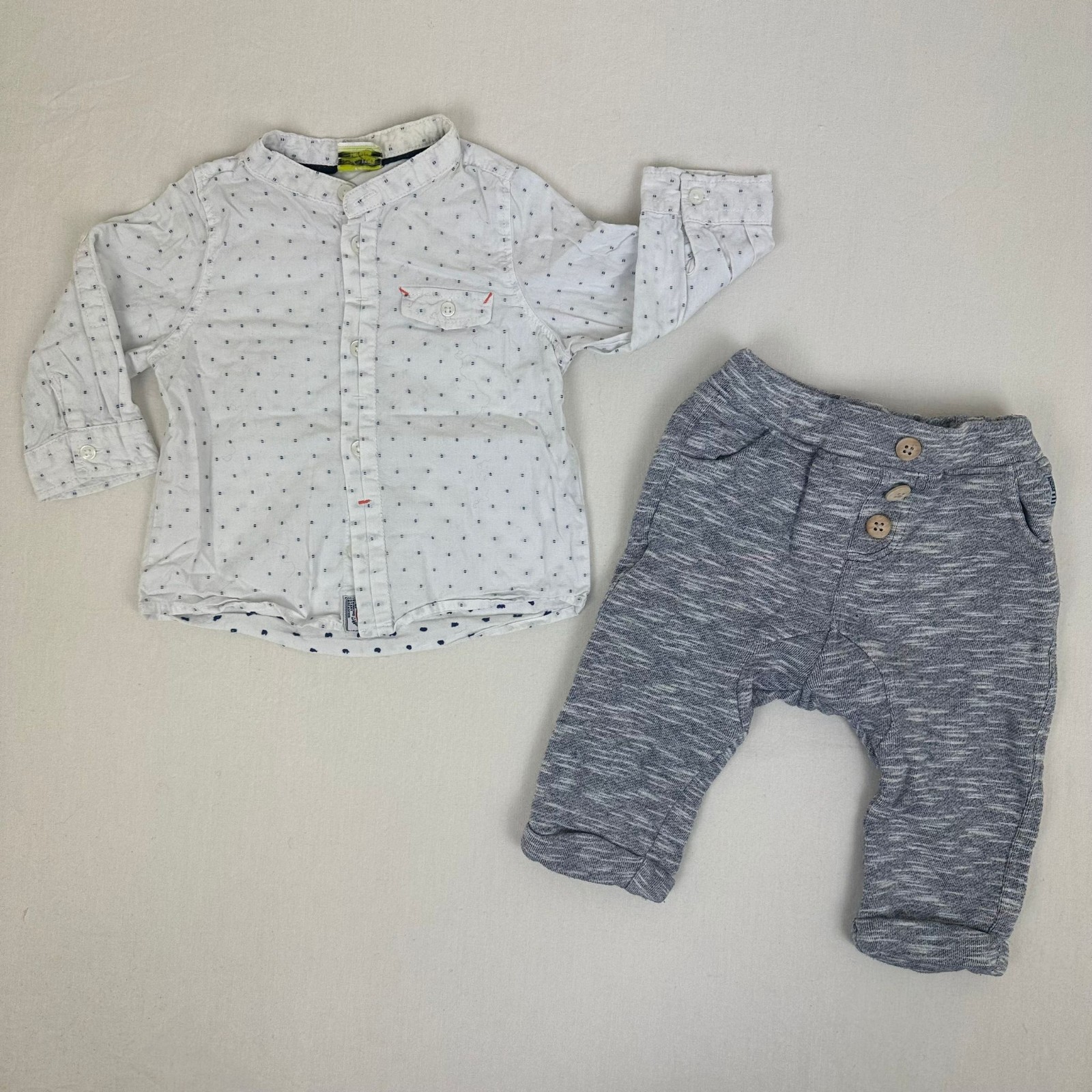 Autres commentaires : Chemise blanche avec des points bleus manches longues avec une fermeture par boutons.Pantalon jogging bleu avec taille élastiquée.