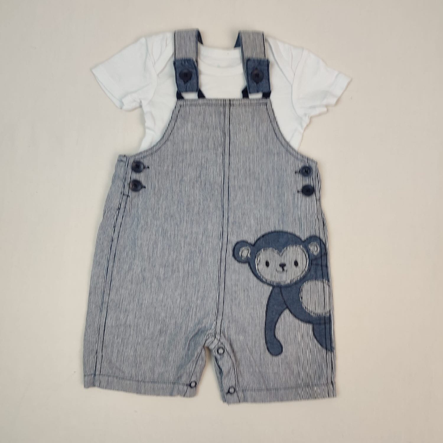 Autres commentaires : Ensemble 2 pièces : – Salopette courte bleu foncé à rayures blanches motif singe, fermeture latérale par boutons et à l’entrejambe par boutons pression. – Body manches courtes uni blanc.