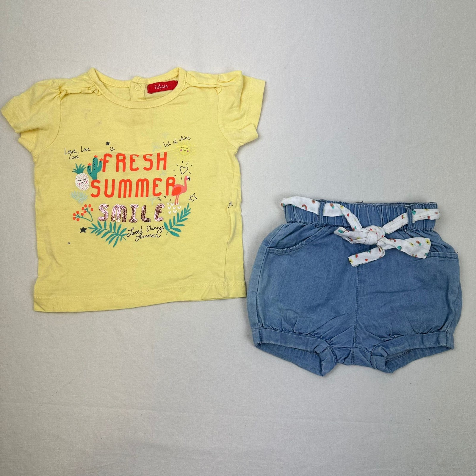 Autres commentaires : T-shirt manches courtes jaune avec motif « Fresh Summer Smile » et une fermeture au dos par boutons pressions. Short bleu avec une taille élastiquée et fermé avec cordon. Petit défaut:3 petites tâches d’encre stylo sur la devanture du t-shirt.