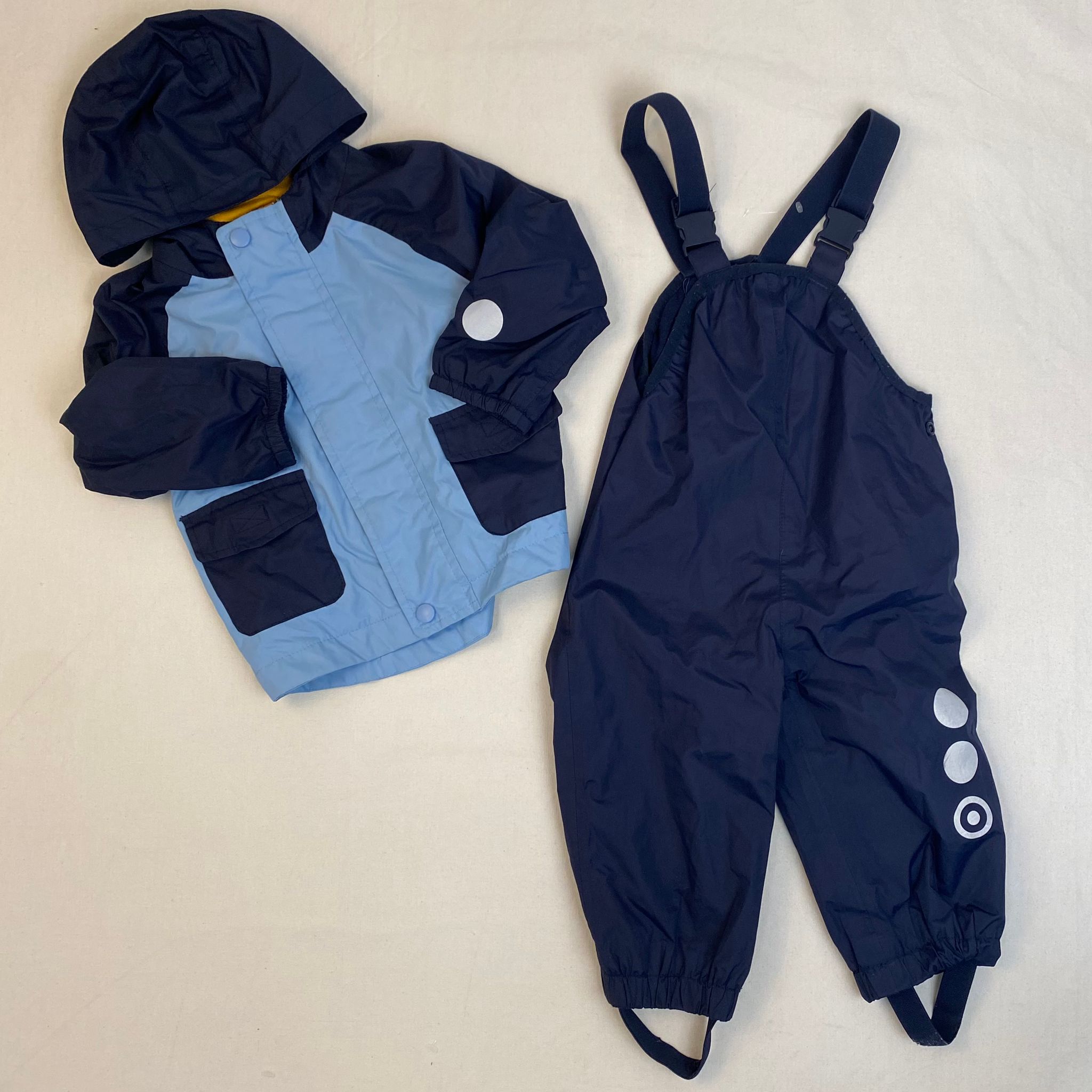 Ensemble de pluie (35% de coton dans la doublure interne) : -1 imperméable bleu avec fermeture éclair et boutons pression, manches élastiquées ; -1 surpantalon de pluie à bretelles avec chevilles élastiquées et système d’élastique sous les pieds, taille réglable par boutons pression, bretelles réglables par boucles coulissantes, fermables par un fermoir à clip.