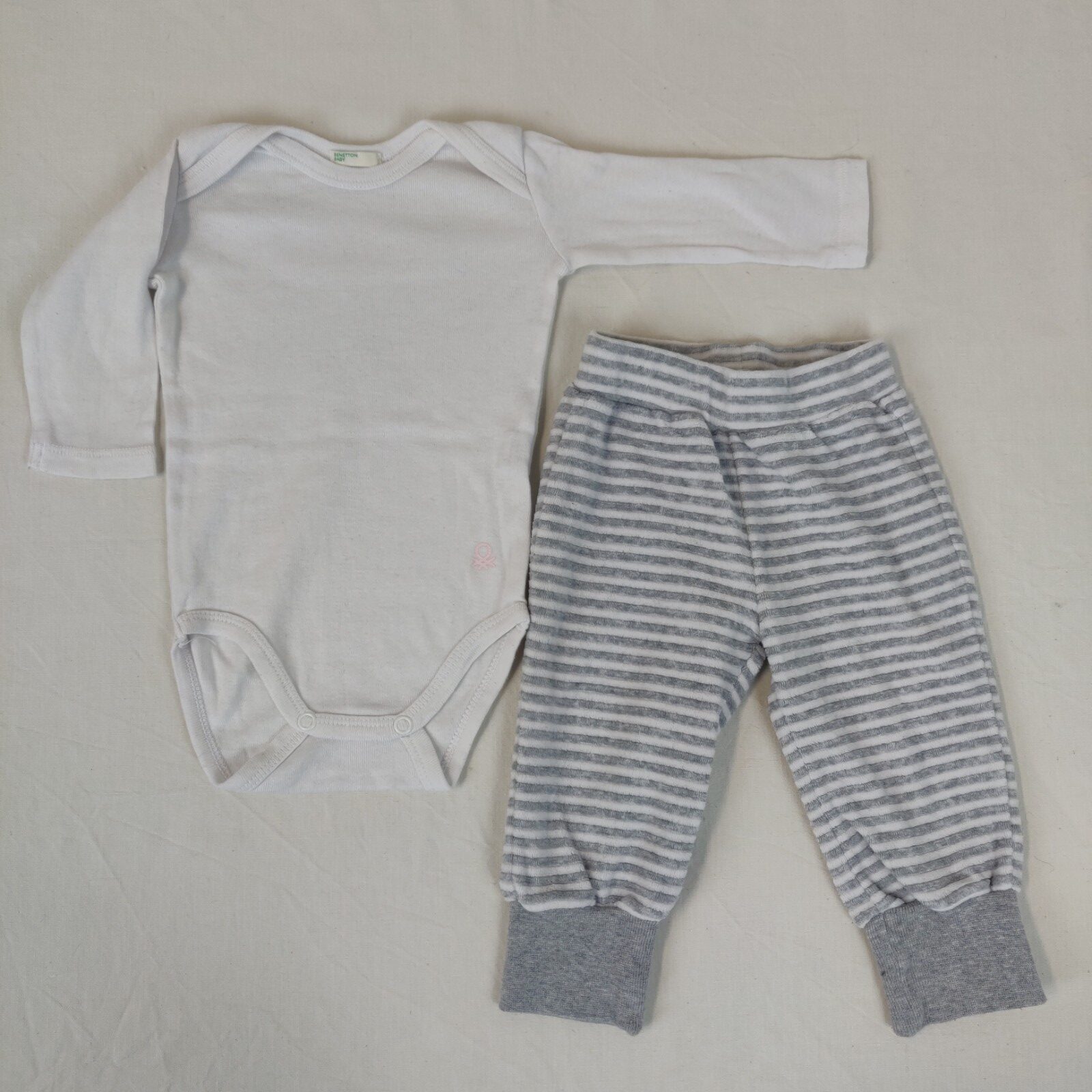 Autres commentaires : Ensemble 2 pièces. Un body à manches longues – blanc avec griffe rose de la marque. Un pantalon en velours blanc rayé gris. Taille et chevilles élastiques.