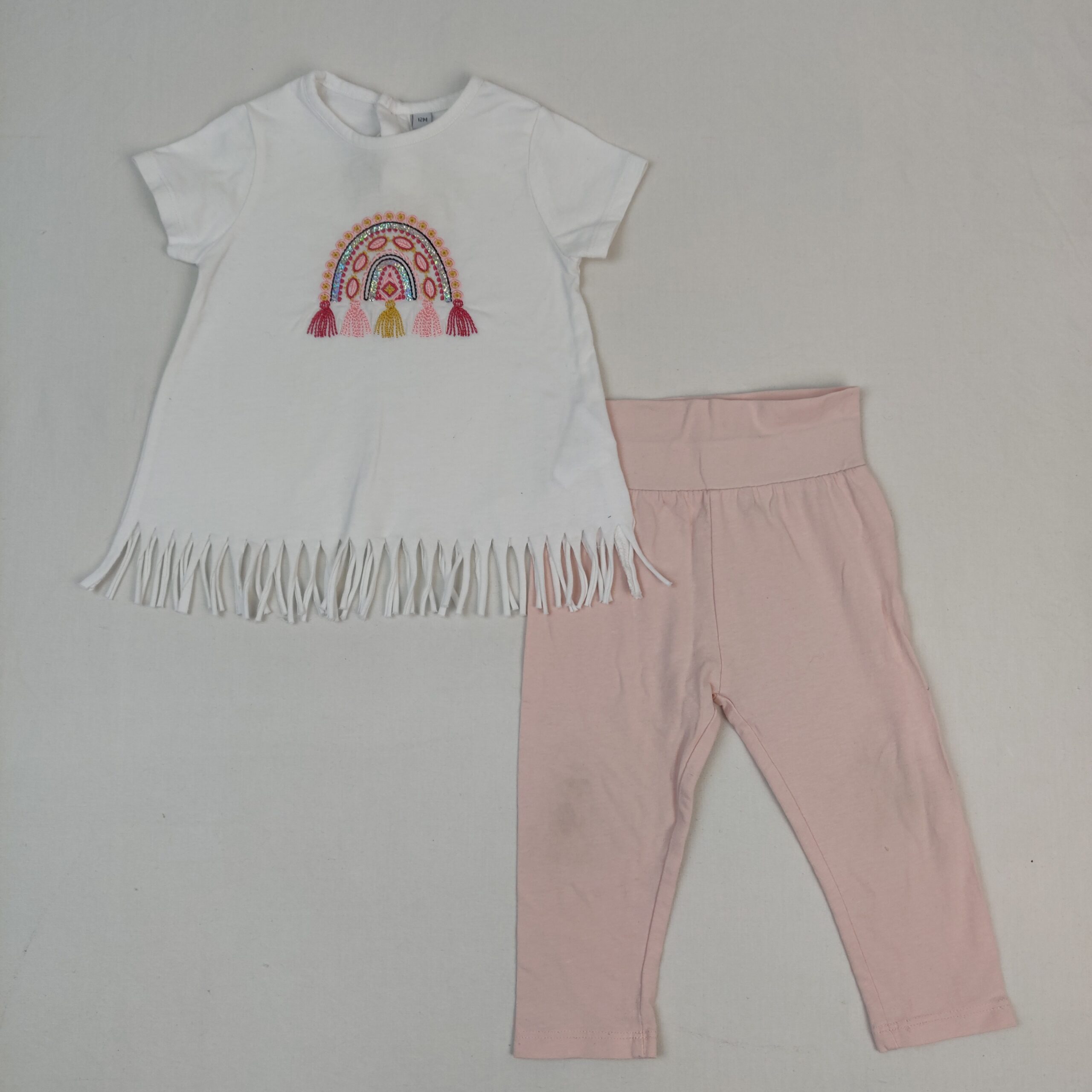 Autres commentaires : Ensemble 2 pièces : – T-shirt blanc à manches courtes à ourlet frangé, broderie arc-en-ciel et pompoms multicolores, fermeture par boutons au dos, 43% polyester. – Legging rose pâle avec une large taille élastique.