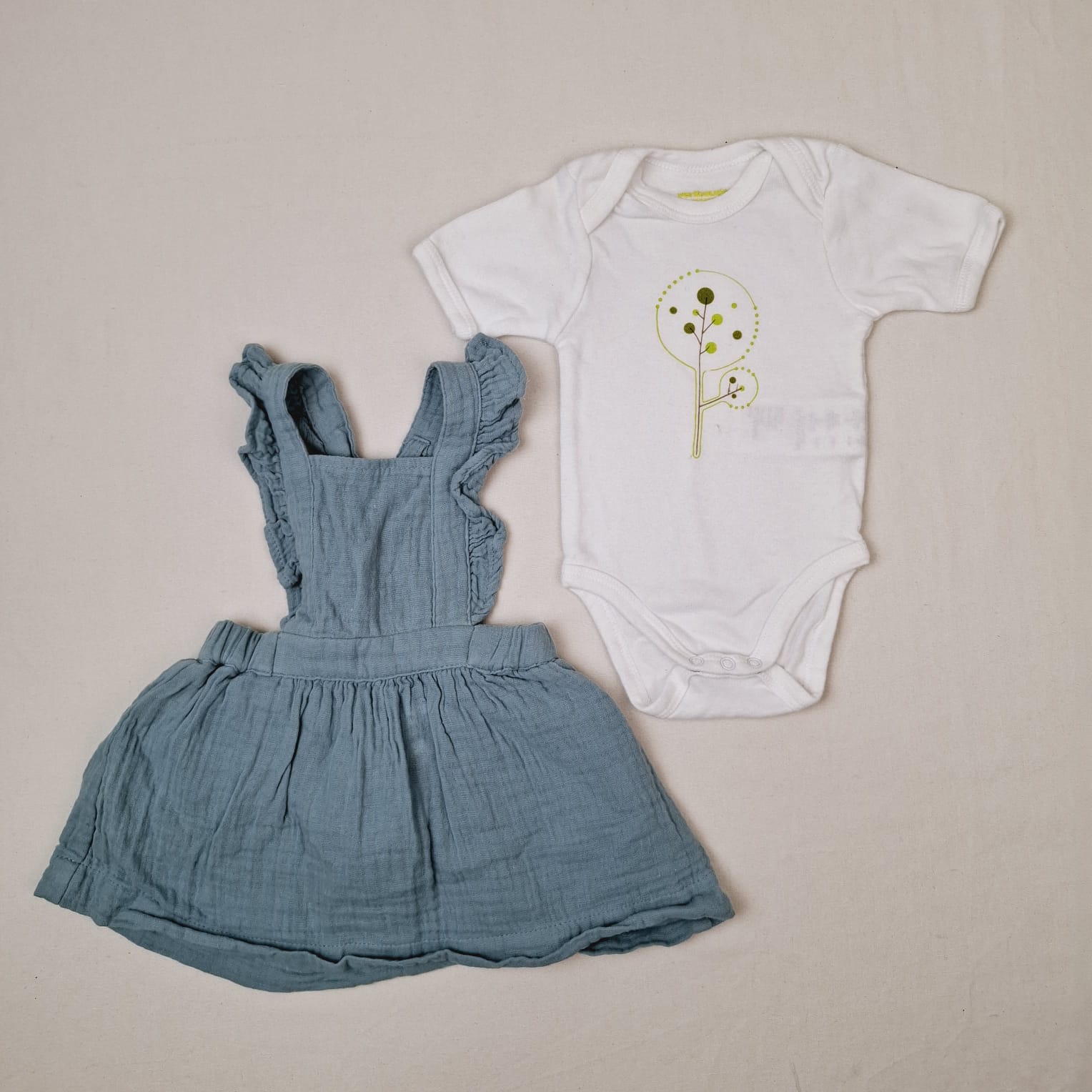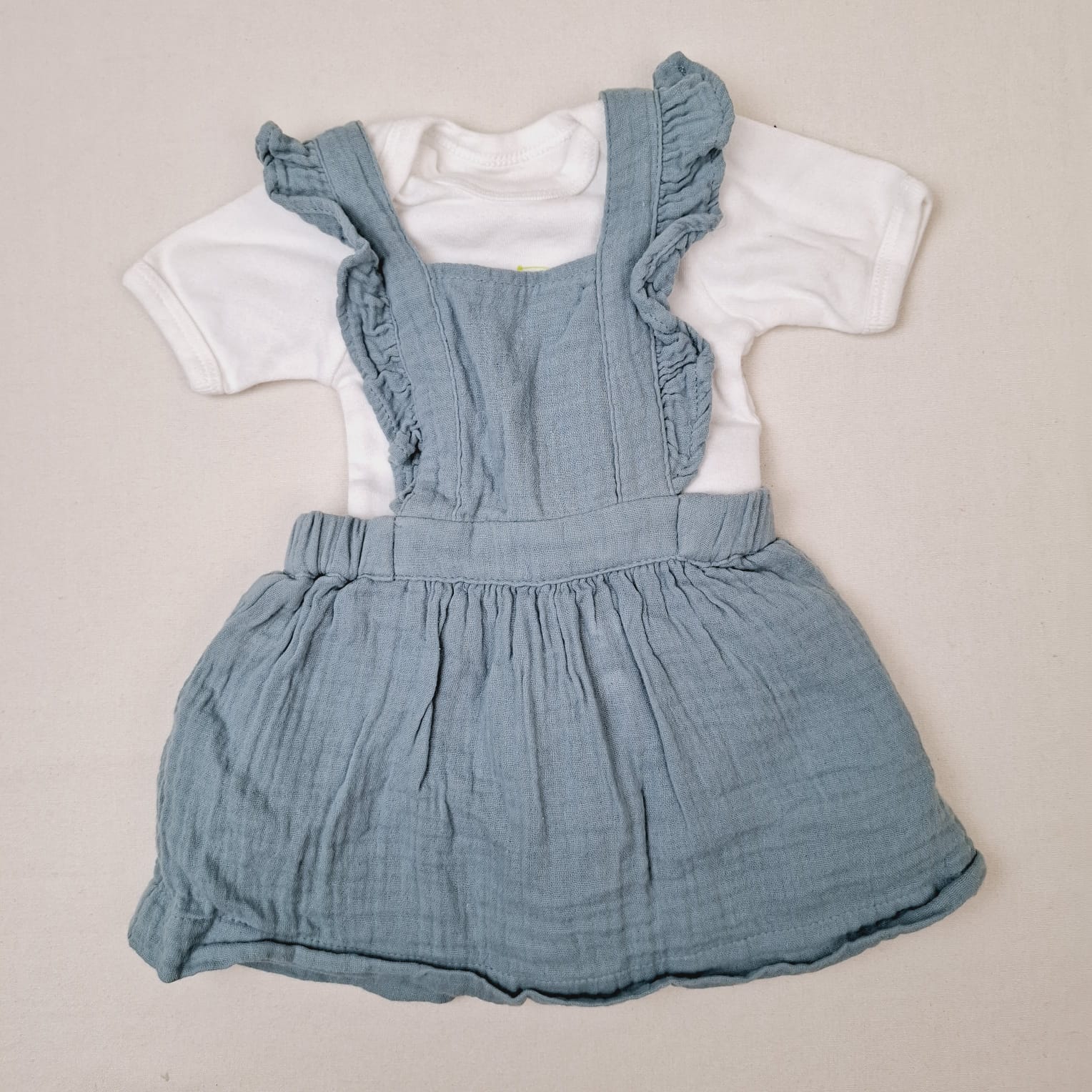 Autres commentaires : Ensemble 2 pièces : Robe tablier en tissu gaufré vert d’eau, volanté aux épaules, bretelles croisées dans le dos, taille élastiquée, doublure au niveau de la jupe en coton. – Body manches courtes blanc uni.