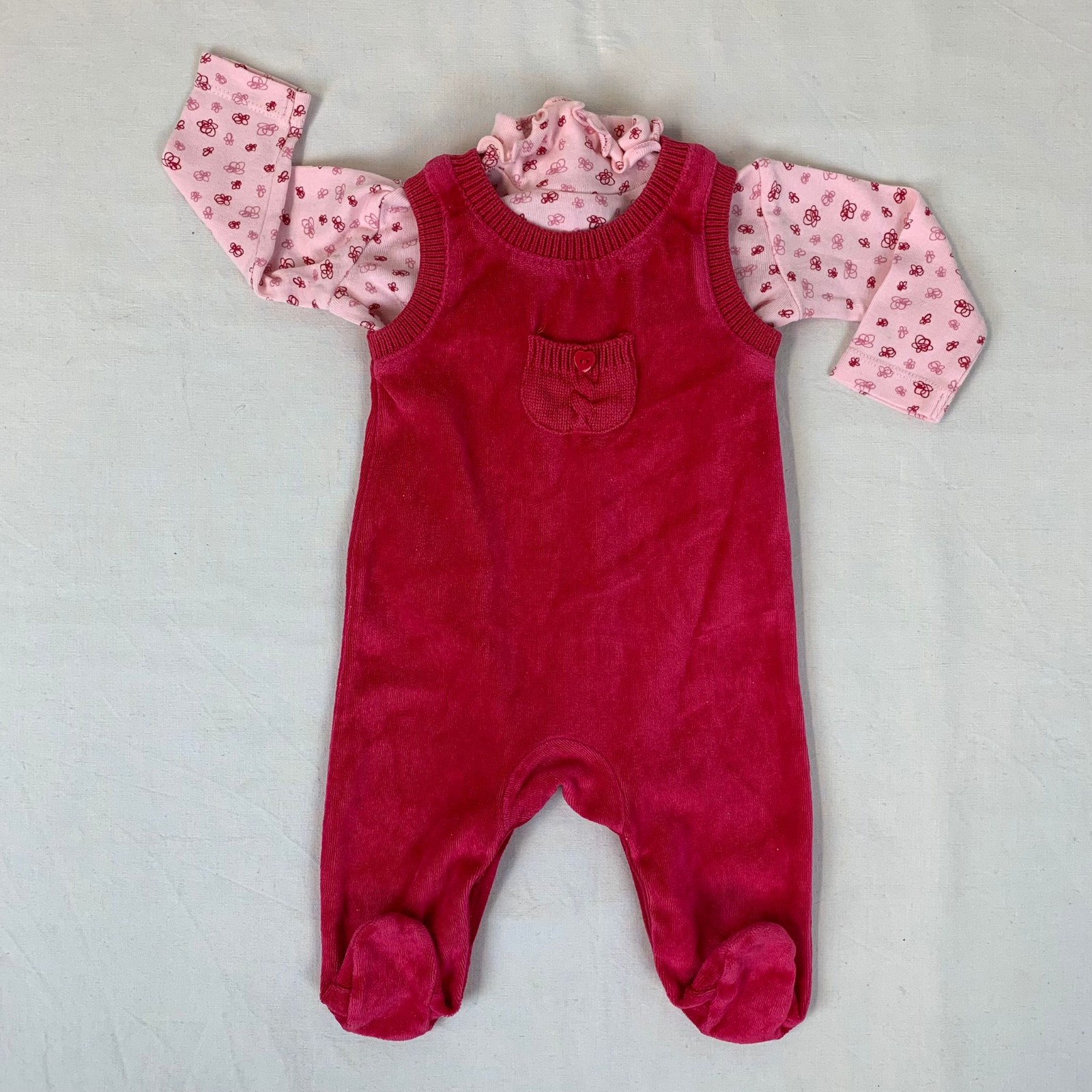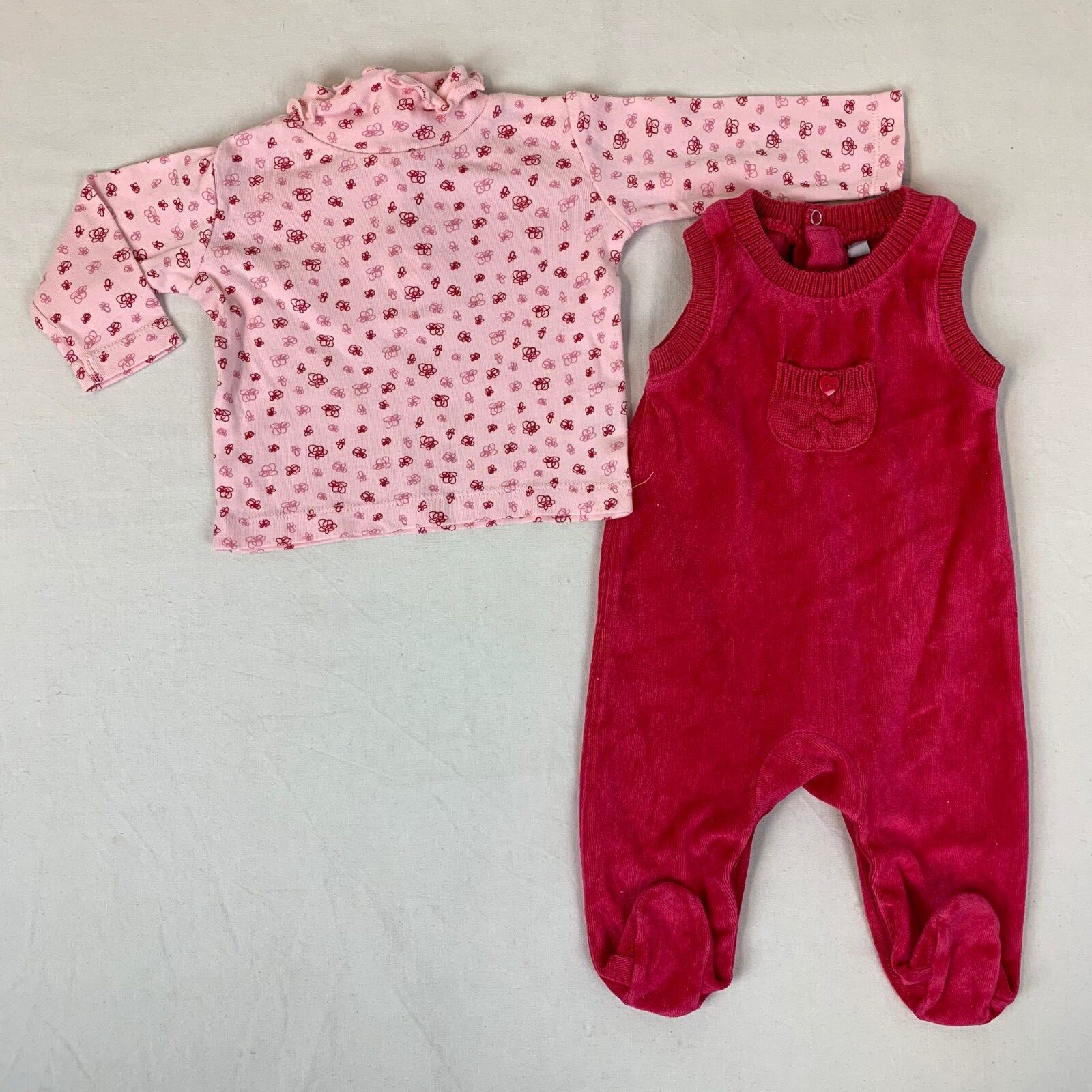 Autres commentaires : T-shirt rose Verbaudet manches longues en fleurette col roulé. Combinaison longues rose sans manches.