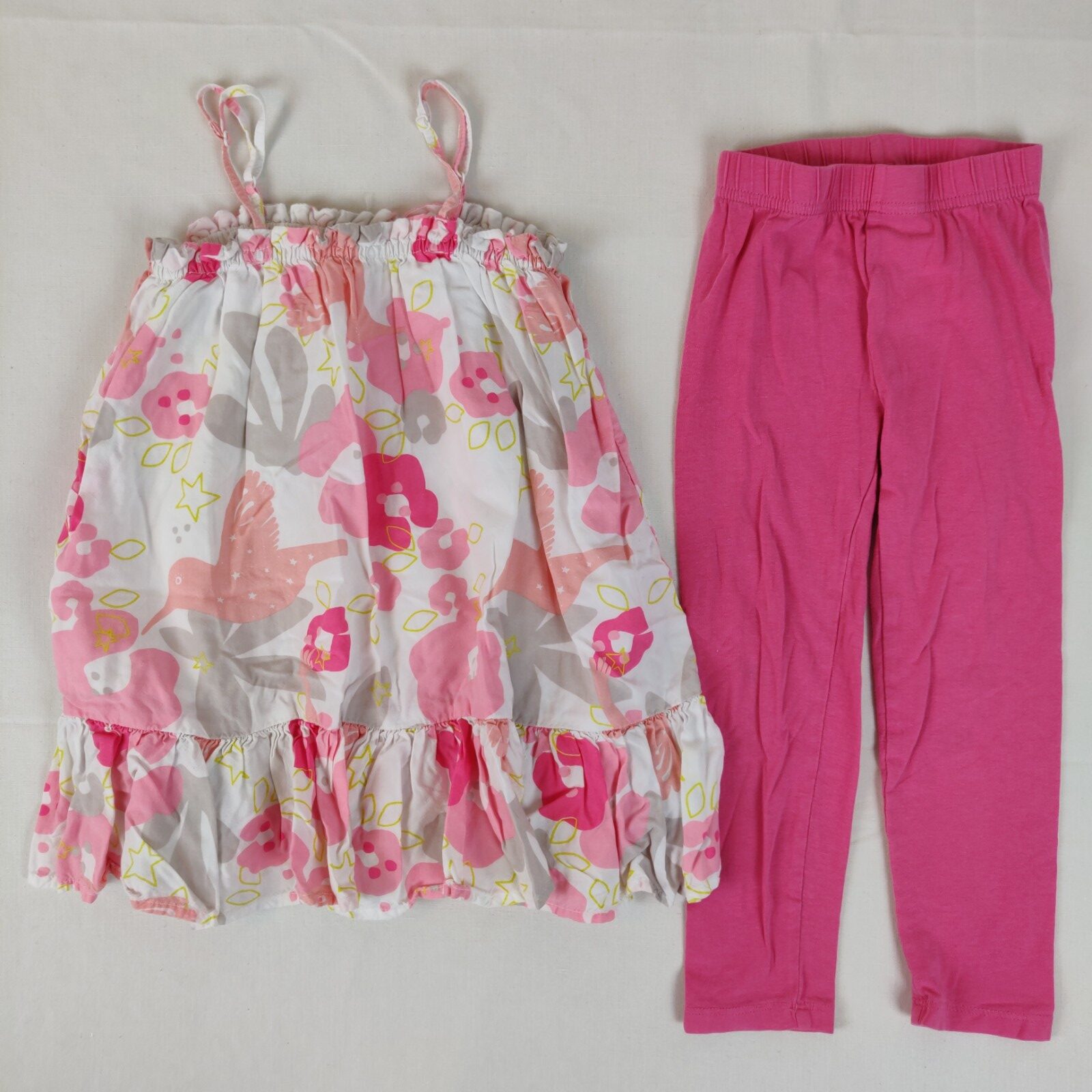 Autres commentaires : Robe à bretelles blanche à motifs fleurs et oiseaux roses et gris, marquée 3A et 8A -!!-. Nous pensons qu’elle est adaptée à du 4 ans avec un legging de la même marque rose fushia. Potentiellement utilisable plus tard en tunique.