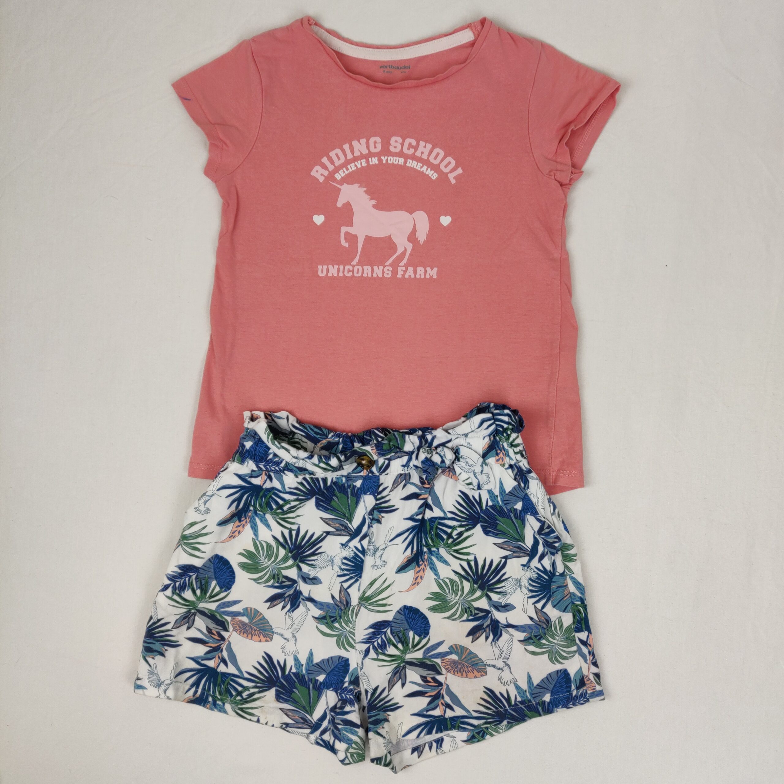 Autres commentaires : Short blanc cassé (100% viscose) avec végétation et oiseaux exotiques dans les tons bleus, verts et rose pêche, taille ajustable et un t-shirt manches courtes rose pêche (100% coton) avec licorme ton sur ton et inscription Riding school / Believe in your dreams / unicon Farm.