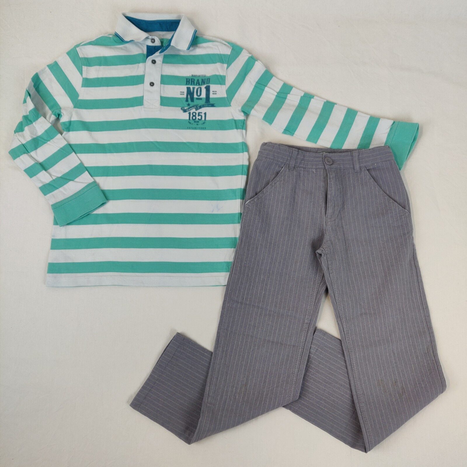 Autres commentaires : Ensemble 2 pièces. Un polo à manches courtes – blanc rayé vert. Ouverture centrale à 3 boutons. Tâches bleues au niveau du haut du col et du bas du polo. Un pantalon – gris avec de fines rayures écrues. Taille ajustable. 2 poches latérales et 2 poches arrières. Passants pour une ceinture. Tâches marrons discrètes au niveau du bas des jambes. Niveau réduit de fraise à myrtille.