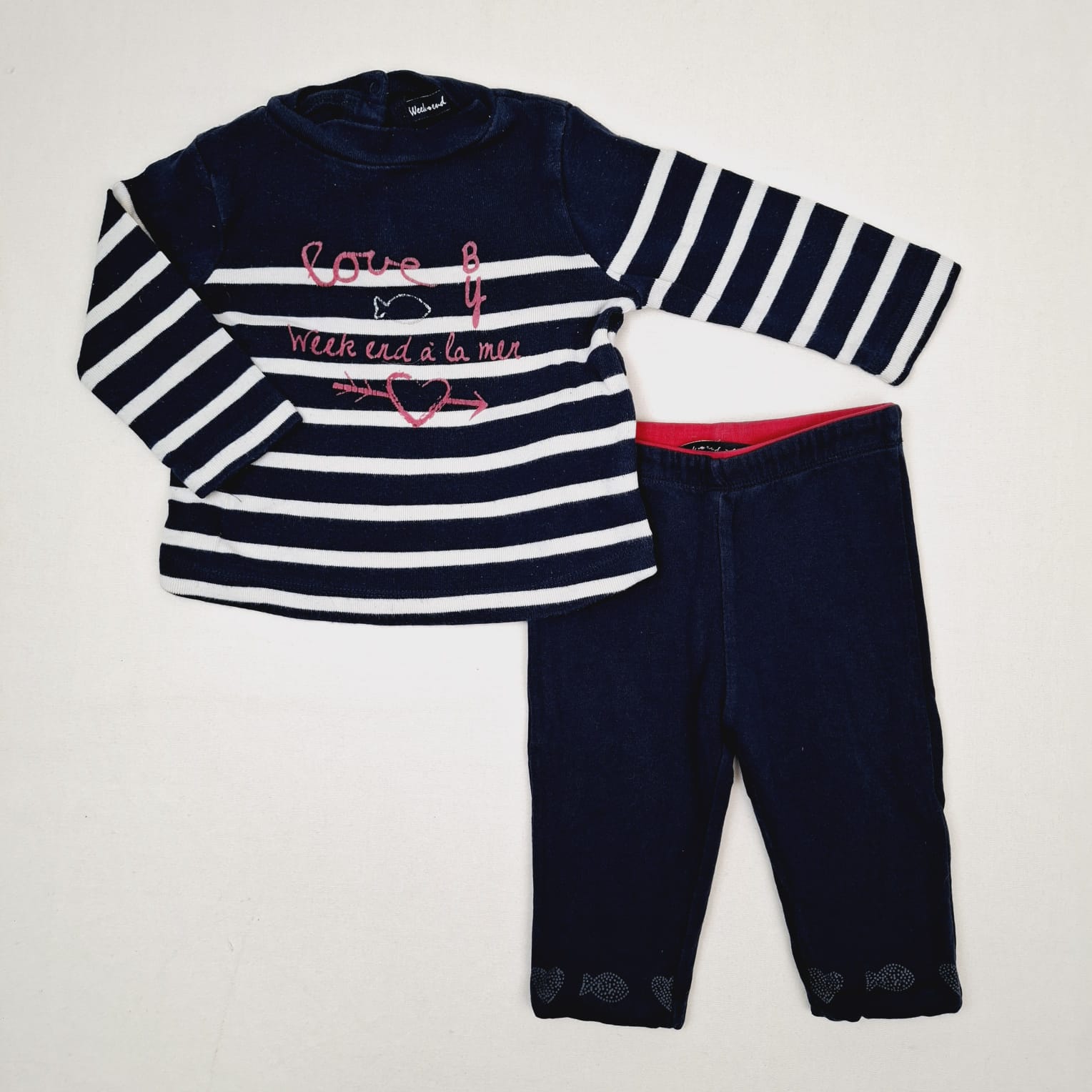 Autres commentaires : Ensemble 2 pièces: – T-shirt bleu marine à rayures blanches à manches longues, fermeture par boutons pression au dos, col montant, inscription « Love by Weekend à la mer », 100% coton. – Legging réversible, rose fuchsia et bleu marine assorti, taille élastique.