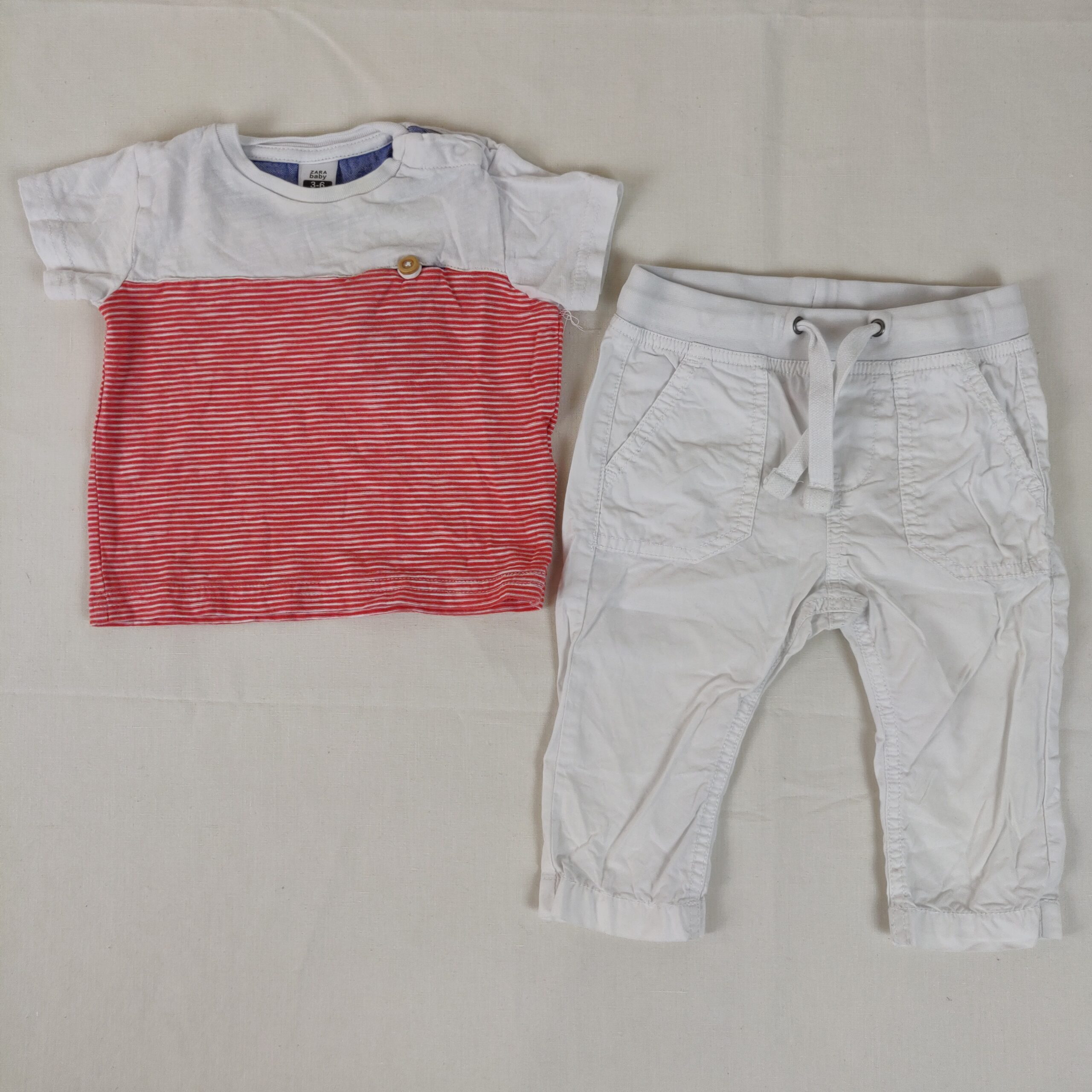 Autres commentaires : Pantalon – blanc – taille élastique avec cordon blanc. 2 poches latérales et 2 poches arrières en trompe-l’oeil. T-shirt à manches courtes en deux parties distinctes. Partie supérieure blanche, partie inférieure à rayures blanches et rouges. Très légére tâche au niveau du col.