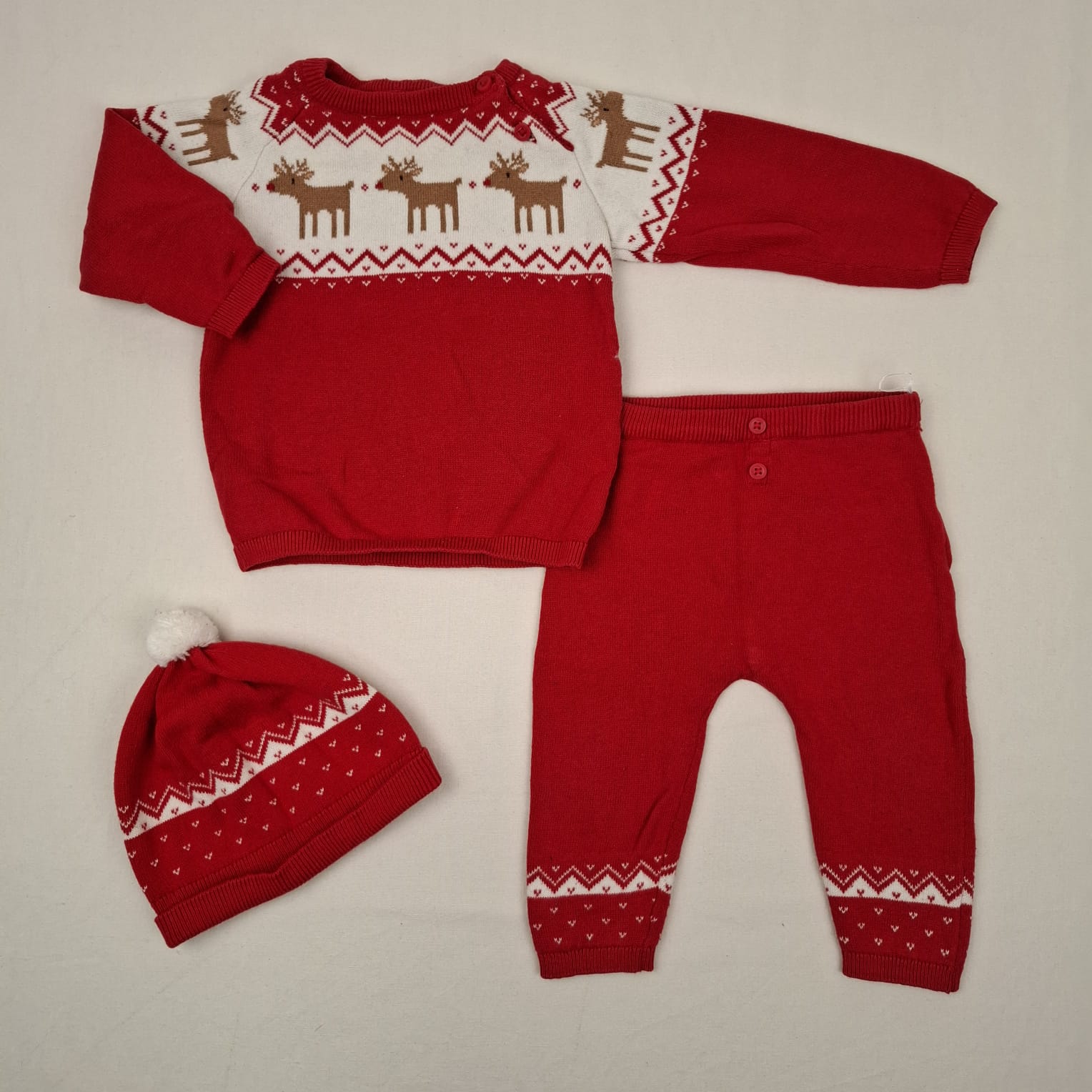 Autres commentaires : Ensemble de Noël, 3 pièces assorties, en tricot rouge : – Pull avec frises de rennes et de mini bois de rennes. – Pantalon avec frise de rappel en bas des jamabre, taille élastiquée et devant petits boutons décoratifs. – Bonnet avec revers et pompom blanc au sommet.