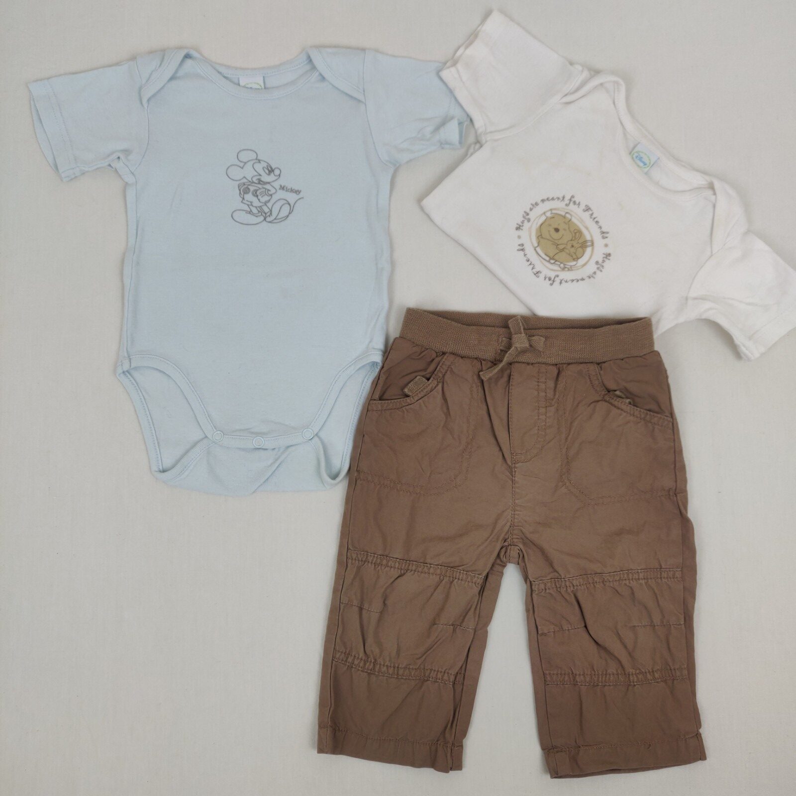 Autres commentaires : 2 body manches courtes bleu et blanc. Pantalon marron avec taille élastiquée.