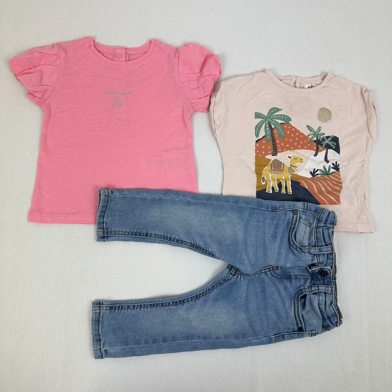 Autres commentaires : Jean bleu avec taille élastiquée et ceinturée. T-shirt manches courtes rose avec motif savane et une fermeture au dos par un bouton. T-shirt manches courtes avec une fermeture par boutons pressions.