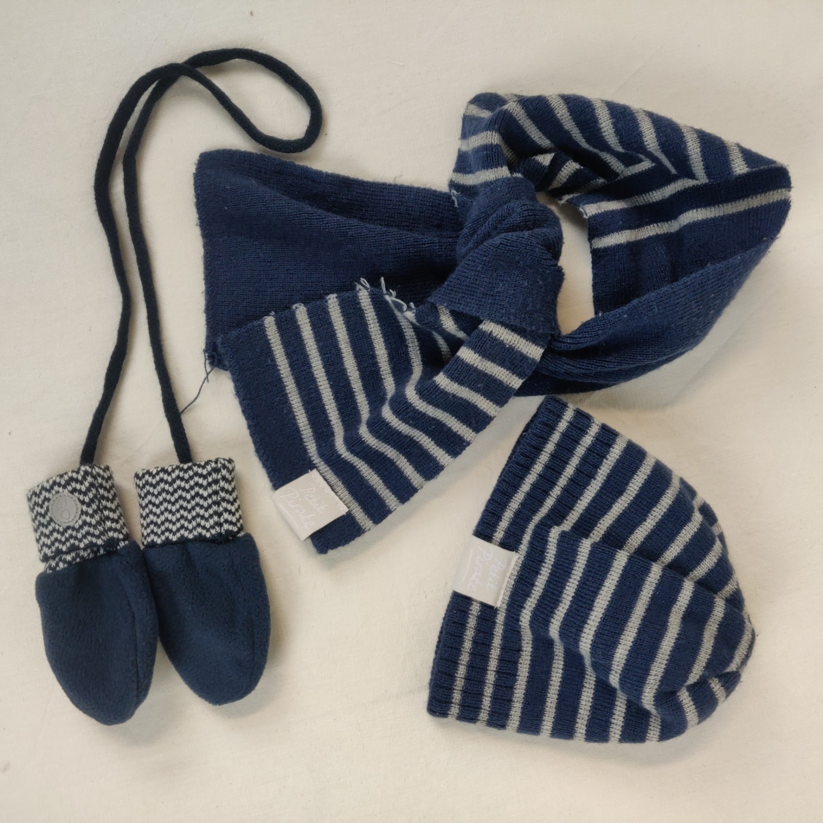 Autres commentaires : Ensemble 3 pièces. Un bonnet en fines mailles bleu marine rayé gris. Etiquette centrale « Petit Pirate ». Echarpe assortie. Une paire de moufles attachées l’une à l’autre avec un cordon – en polaire bleu marine. Usure normale.