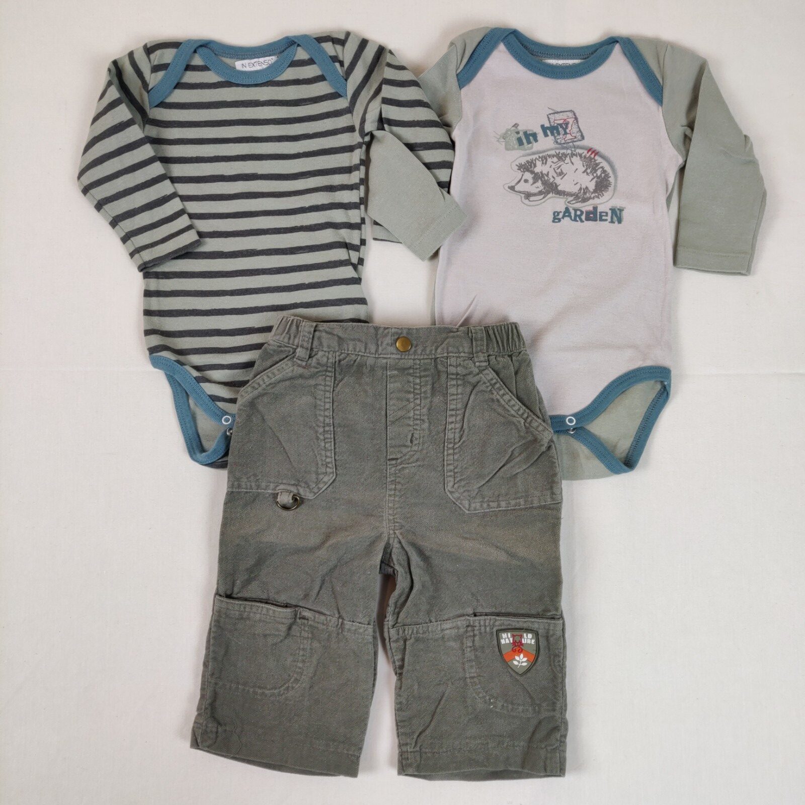 Autres commentaires : Ensemble 3 pièces. 2 bodies. Un body beige et vert kaki avec motif central hérisson et inscription « In my garden ». Un body beige rayé marron foncé avec motif arrière hérisson. Pantalon légèrement décoloré – en velours vert kaki. Taille élastique. 2 poches latérales et 2 poches arrières. Ecusson au bas de la jambe gauche « Wild nature ».