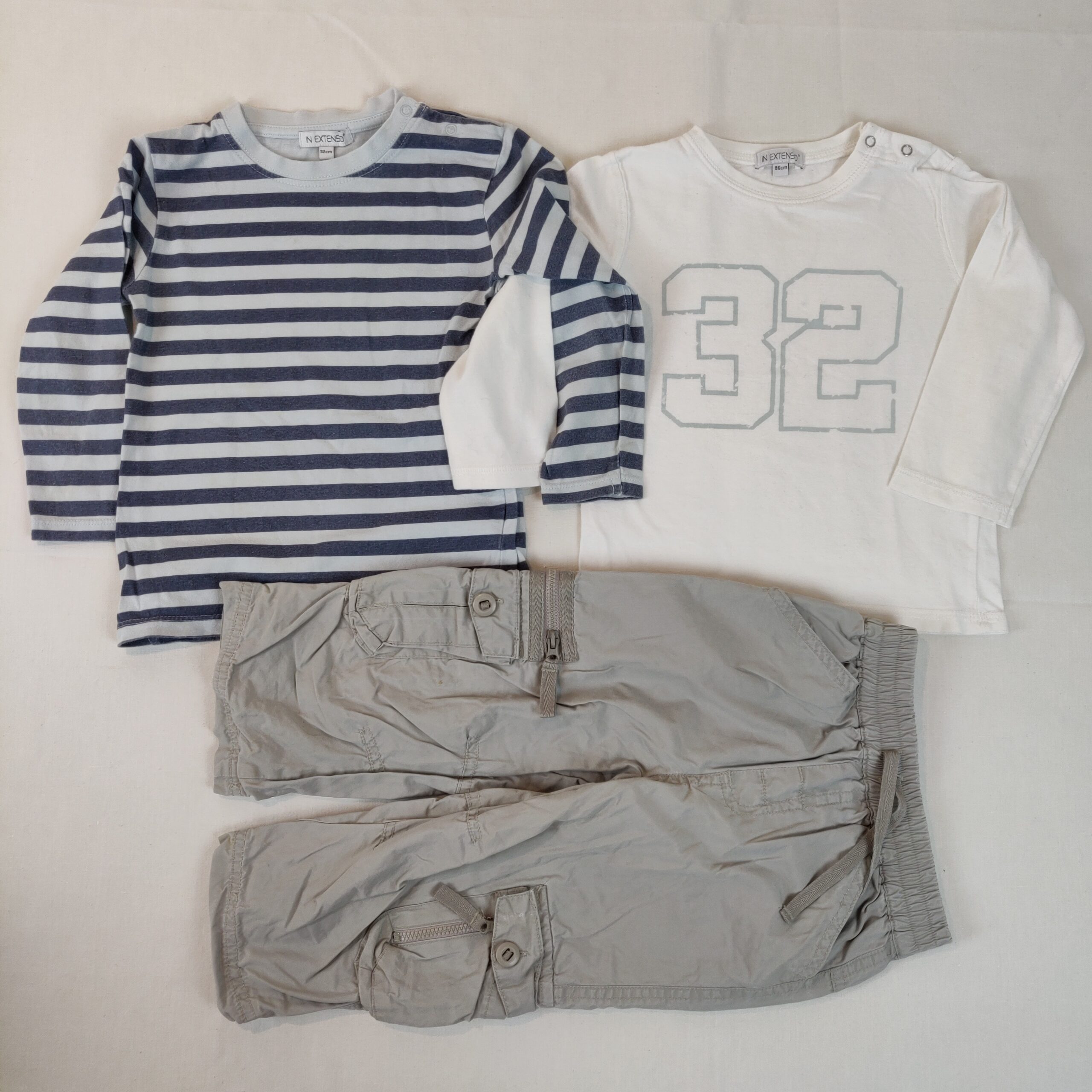 Autres commentaires : Ensemble 3 pièces. Pantalon – taupe – avec taille élastique à cordon. Petite ouverture centrale en trompe-l’oeil. 2 poches sur les genoux à fermeture bouton classique. 2 poches à l’arrière avec bouton classique. Petite tâche sur le devant. T-Shirt à manches longues à rayures horizontales – gris foncé et taupe. Ouverture latérale à partir du col à deux boutons pression. T-Shirt à manches longues écru avec inscription chiffrée. Ouverture latérale à partir du col à deux boutons pression.