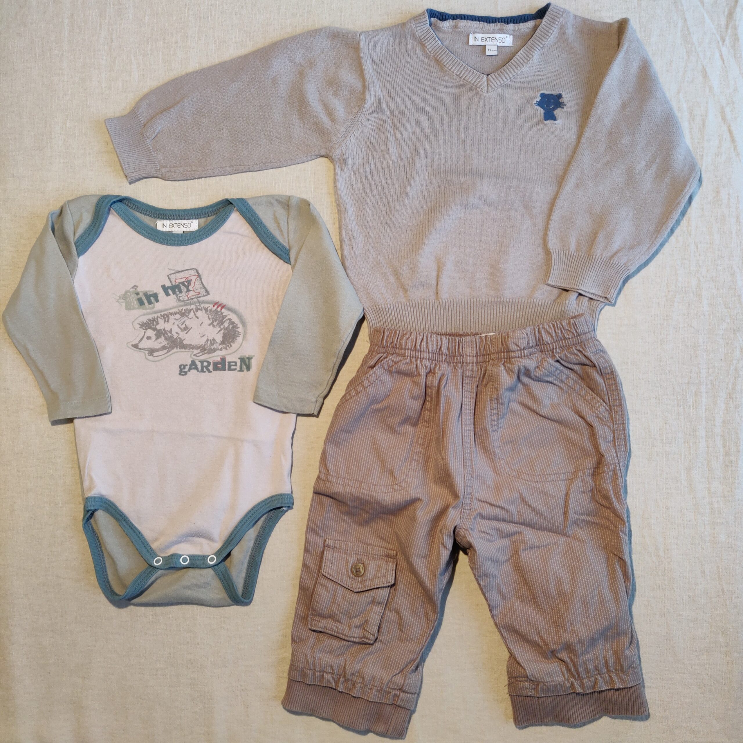 Autres commentaires : Pull bleu beige col V avec doublure bleu canard, 1 body beige à manches vert-kaki et dessin de hérisson « in my garden », fermeture par 3 boutons pression métalliques, pantalon beige à rayures blanc cassé, doublé en coton et taille élastiquée, deux poches à l’avant et une plaquée sur la jambe droite.