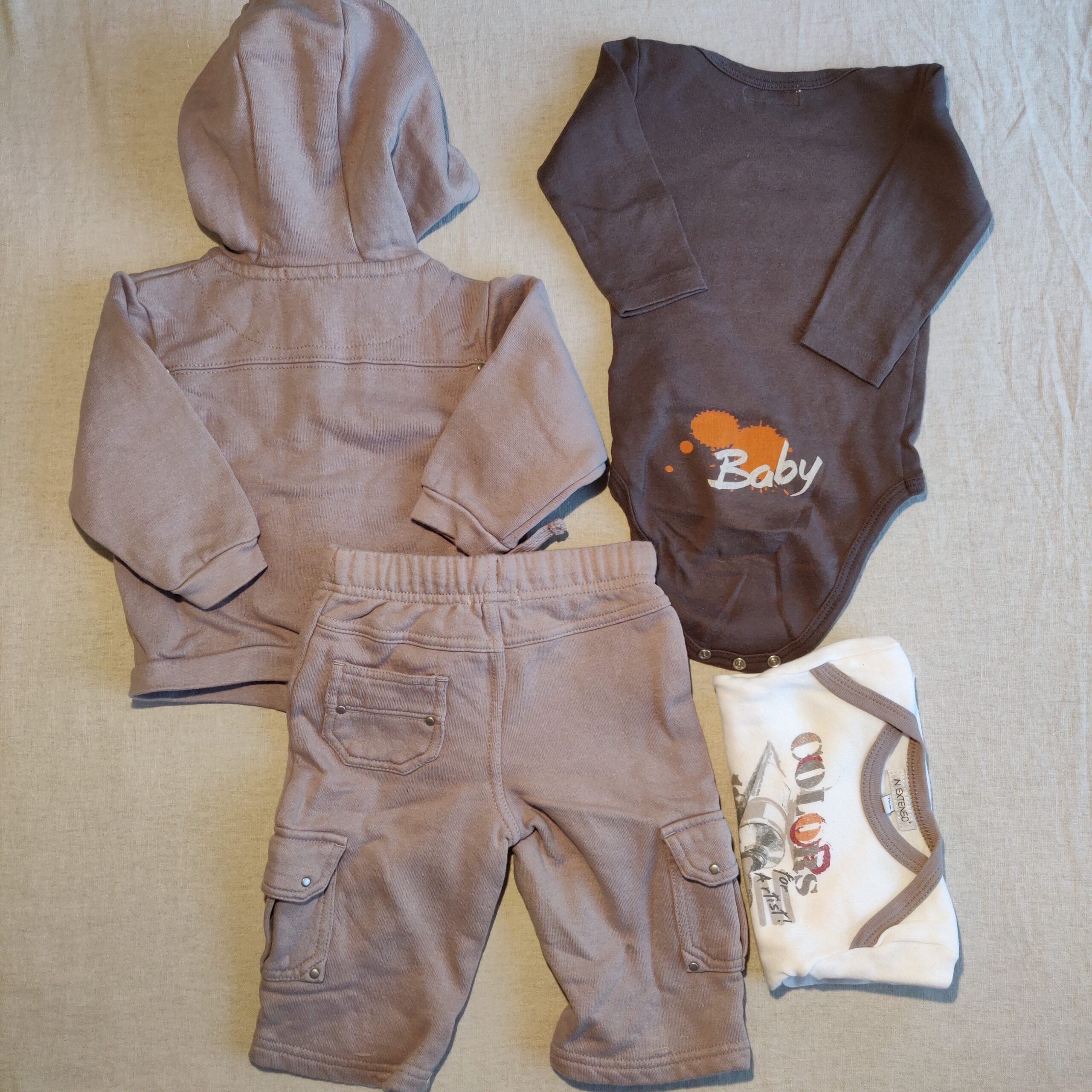 Autres commentaires : Survêtement beige moleton : pantalon poches plaquées au niveau des jambes et taille élastiquée, sweat zippé à capuche, 1 body blanc cassé et 1 marron à manches longues, thème « colors for artists », fermeture par 3 boutons pression métalliques.