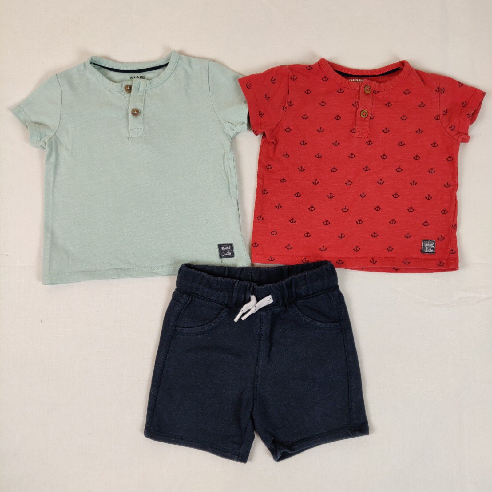 Autres commentaires : Coton biologique – Ensemble 3 pièces. 2 t-shirts à manches courtes, ouverture centrale à boutons. 1 t-shirt vert-bleu. 1 t-shrit rouge à motifs ancres marines. Bermuda en molleton – bleu marine. Taille élastique avec cordon. 2 poches latérales en trompe-l’oeil et 2 poches arrières.