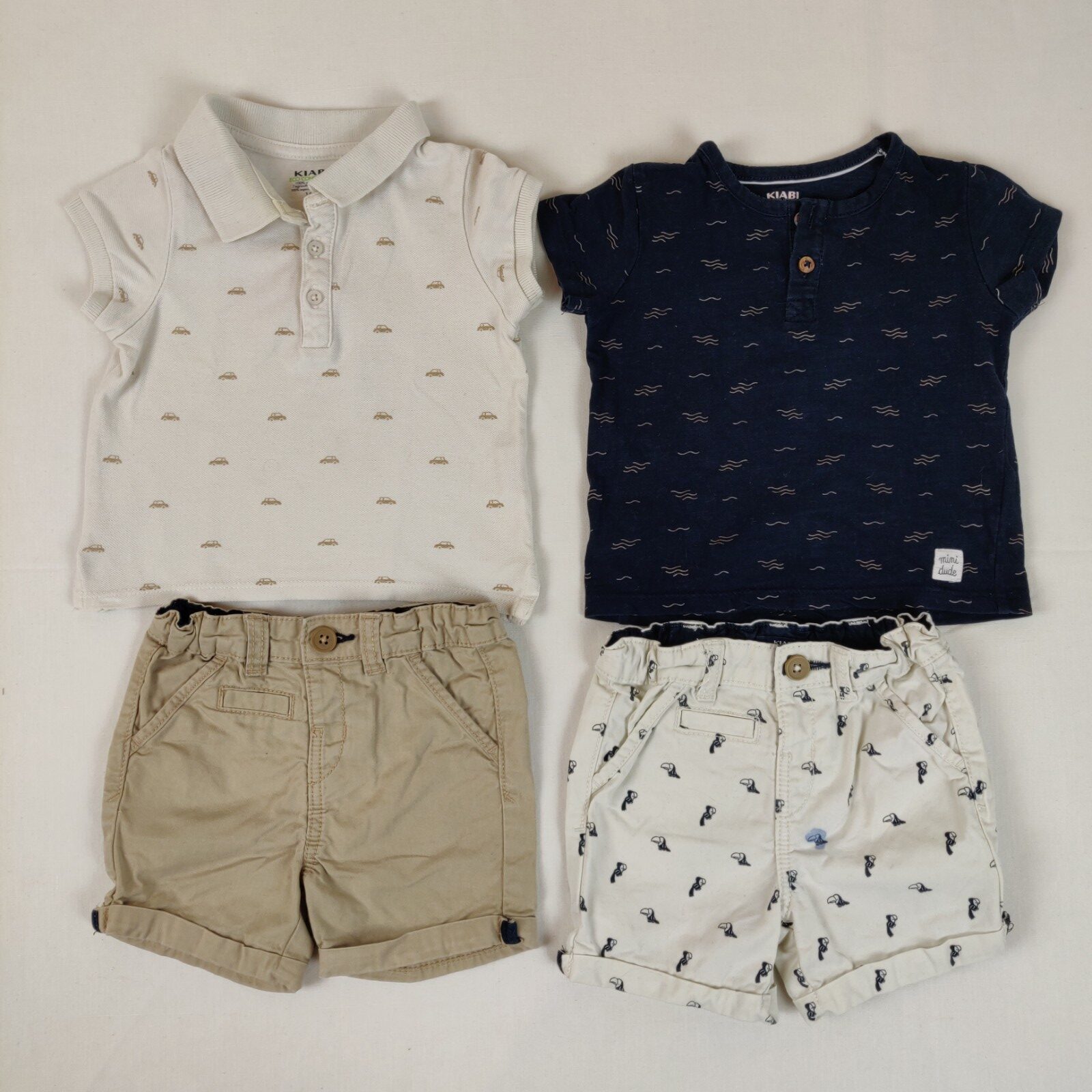 Autres commentaires : Ensemble 3 pièces. Un polo à manches courtes – écru avec des motifs voitures. Ouverture centrale à boutons. Un t-shirt à manches courtes – bleu marine avec des motifs vagues marrons. Ouverture centrale à boutons. Un bermuda beige. Taille ajustable. 2 poches latérales et 2 poches arrières en trompe-l’oeil. Rebords retroussés. Passants pour une ceinture. Bermuda blanc offert (tâche bleu marine).