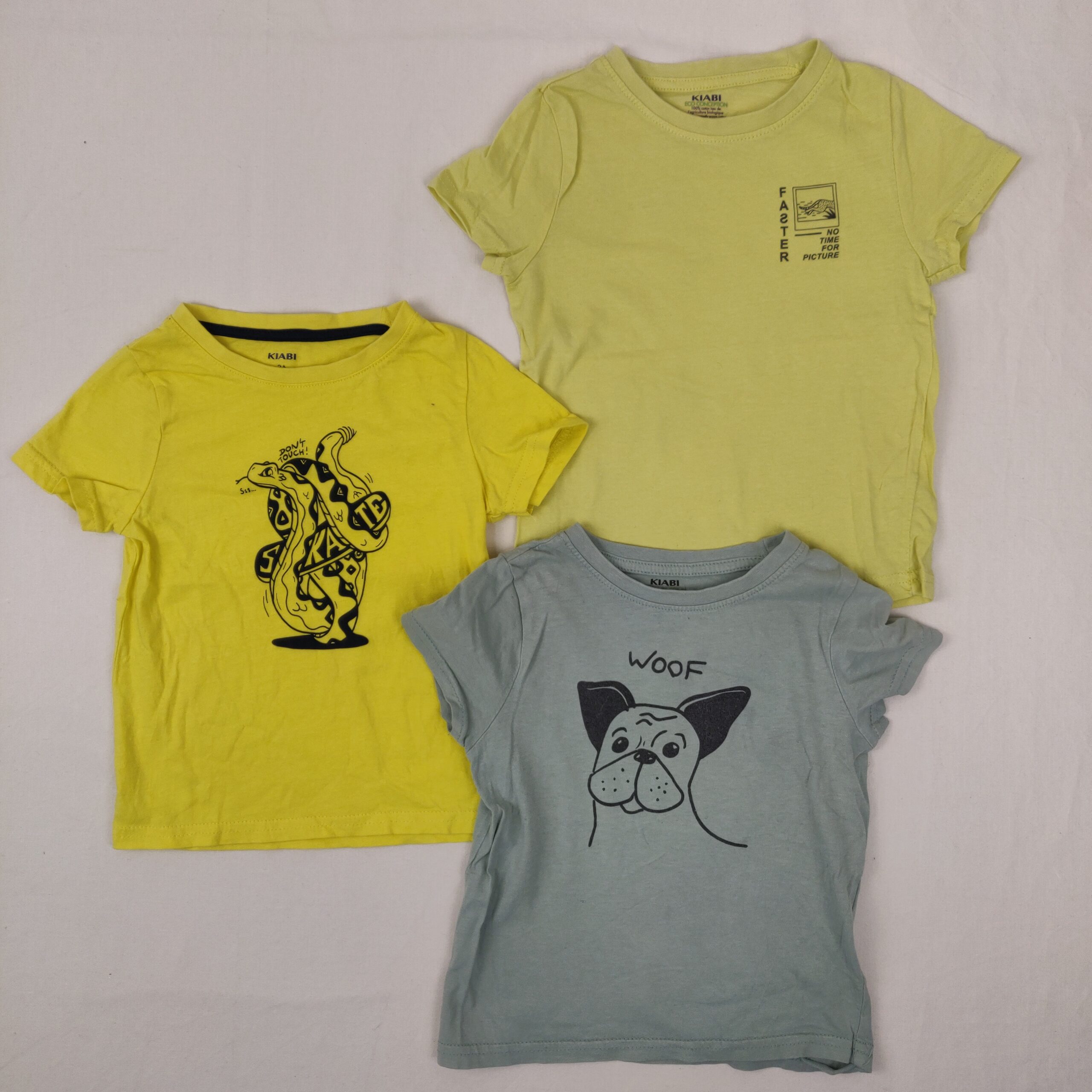 Autres commentaires : Lot de 3 t-shirts manches courtes — 2 jaunes et 1 bleu — aux couleurs estivales, avec motifs centrés.