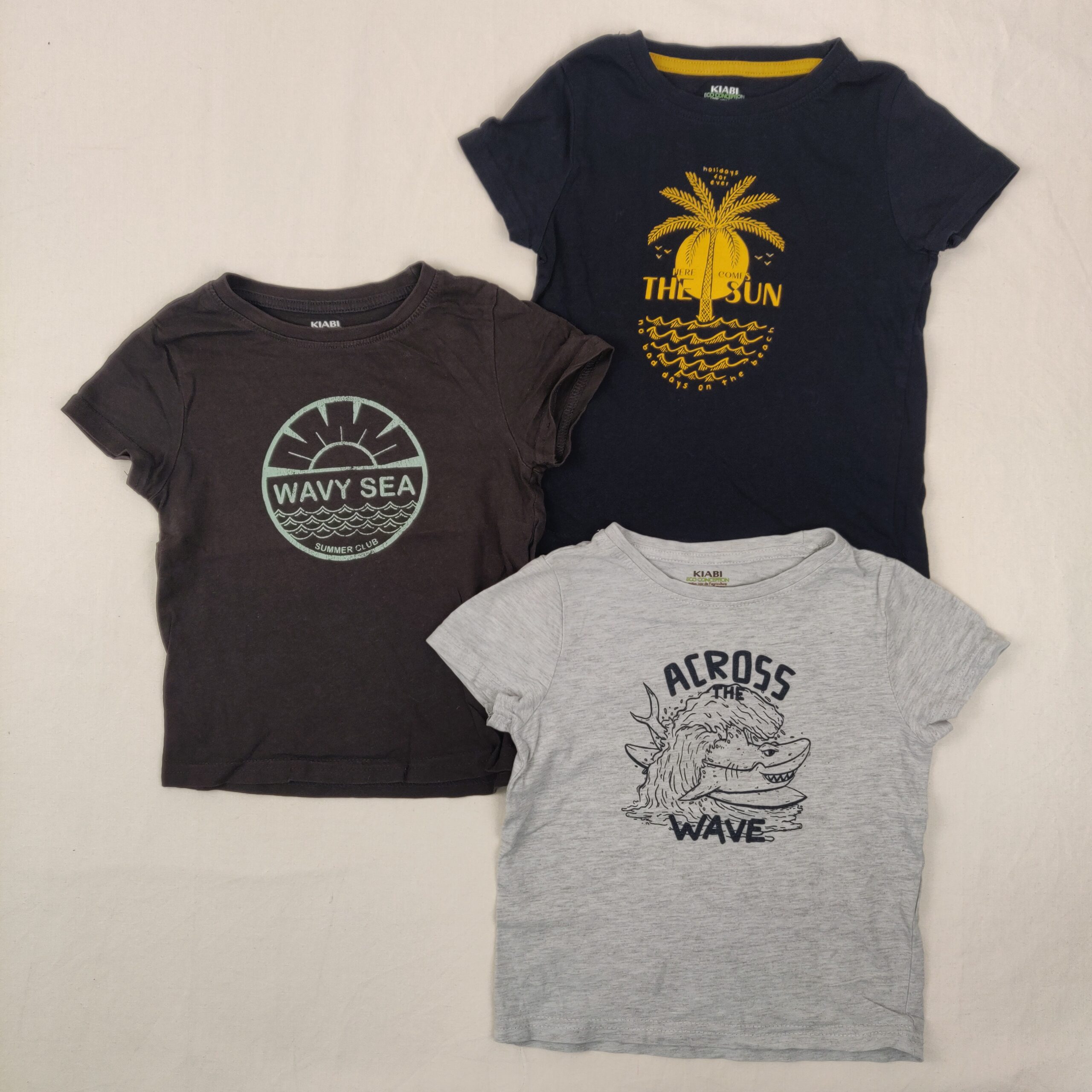 Autres commentaires : Lot de 3 t-shirts manches courtes — gris, motif requin sur une planche de surf, marron, motif soleil sur lamer et bleu marine, motif soleil derrière un palmier.