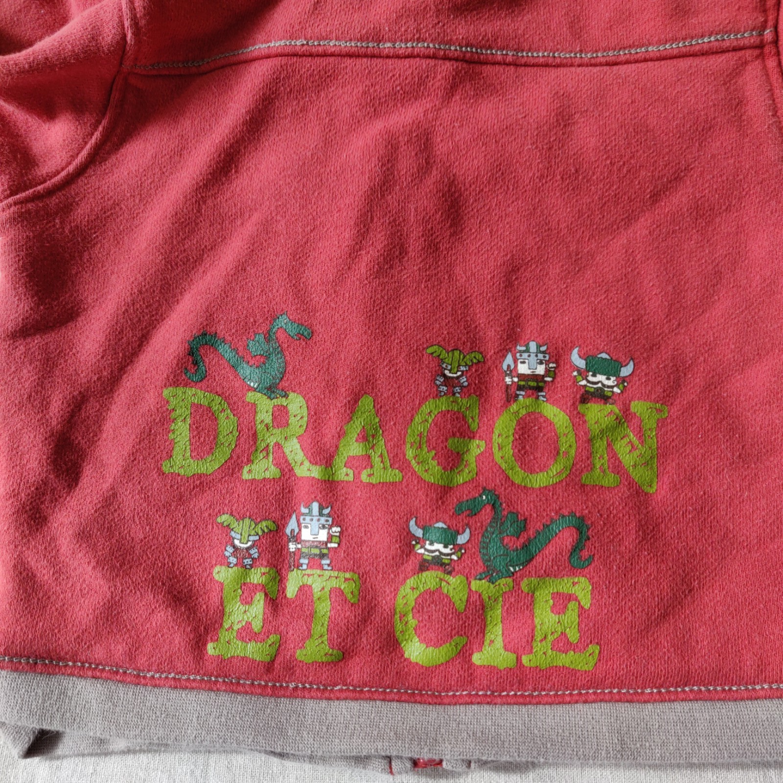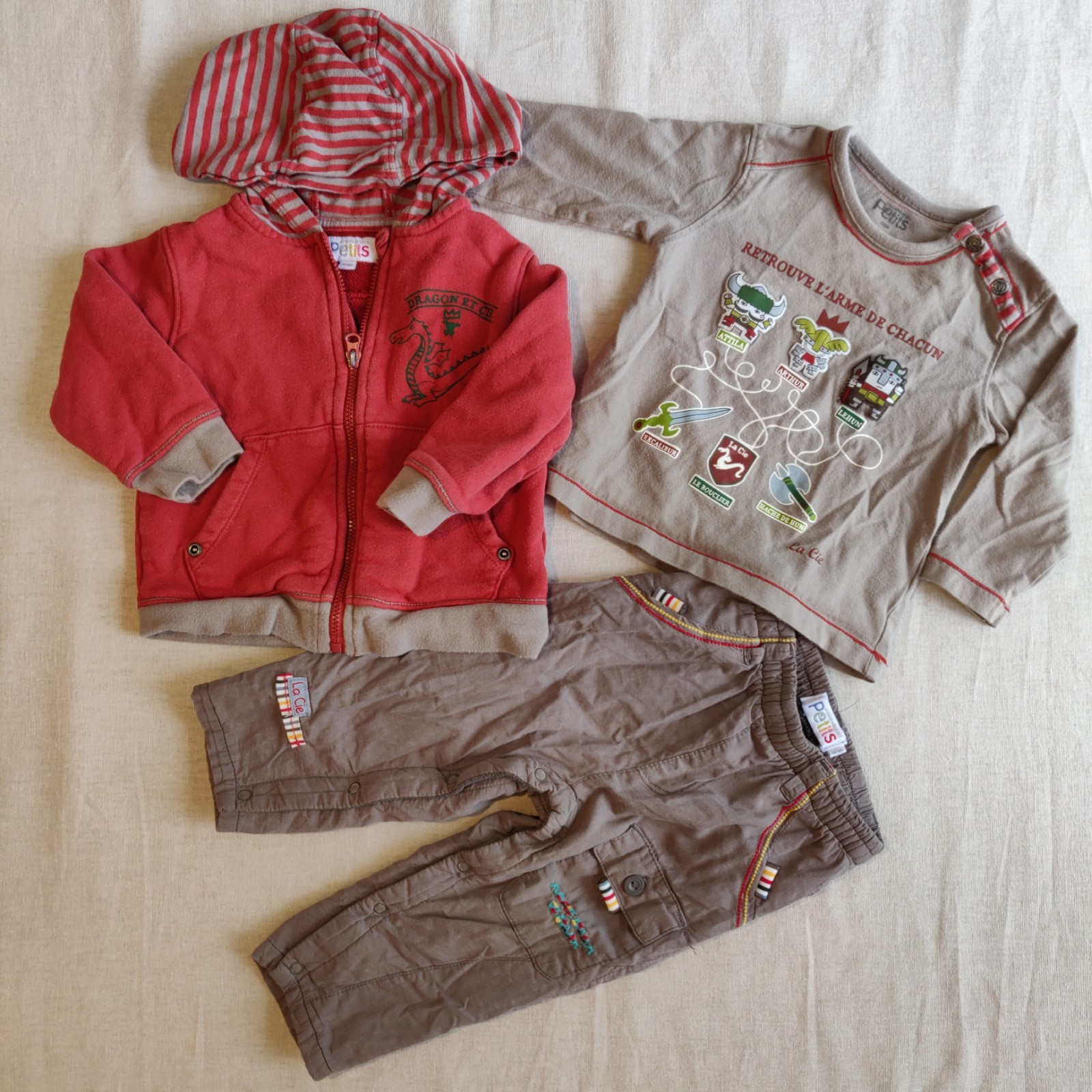 Autres commentaires : Gilet ocre à capuche rayée ocre et taupe. Thème Dragon et Cie, avec un dragon kaki dessiné devant et dragons et guerries derrière. Fermeture par zip. En très bon état. T-shirt à manches longues du même thème en bon état (quelques mini bouloches de portage), représentant les guerriers Attila, Arthur et Lehun avec leurs armes respectives. Fermeture par 2 boutons pression au cou. Pantalon taupe du même thème doublé en polaire -(polyester). une poche plaquée à l’avant, taille élastiquée et fermeture par boutons pression à l’entrejambe. En parfait état.