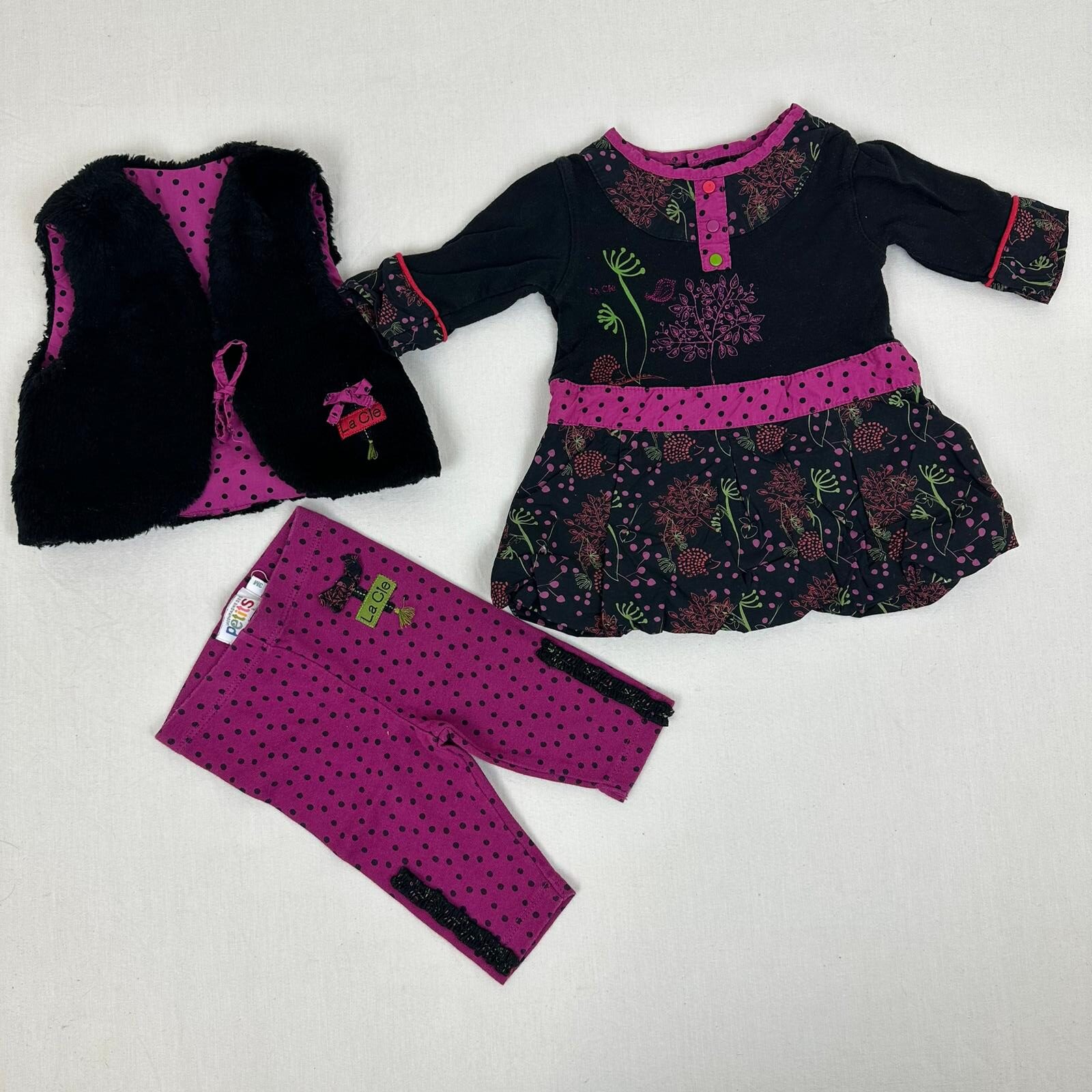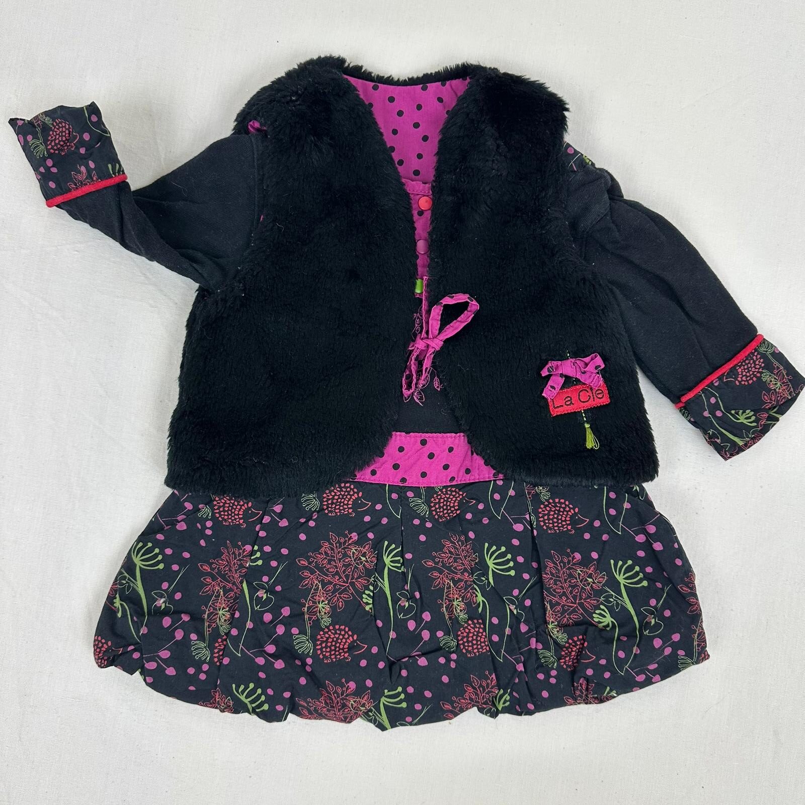 Autres commentaires : Robe manches longues noir avec motif liberty fuscia, rouge et vert. Gilet noir sans manches en fourrure. Legging fuscia avec motif points noirs avec taille élastiquée.