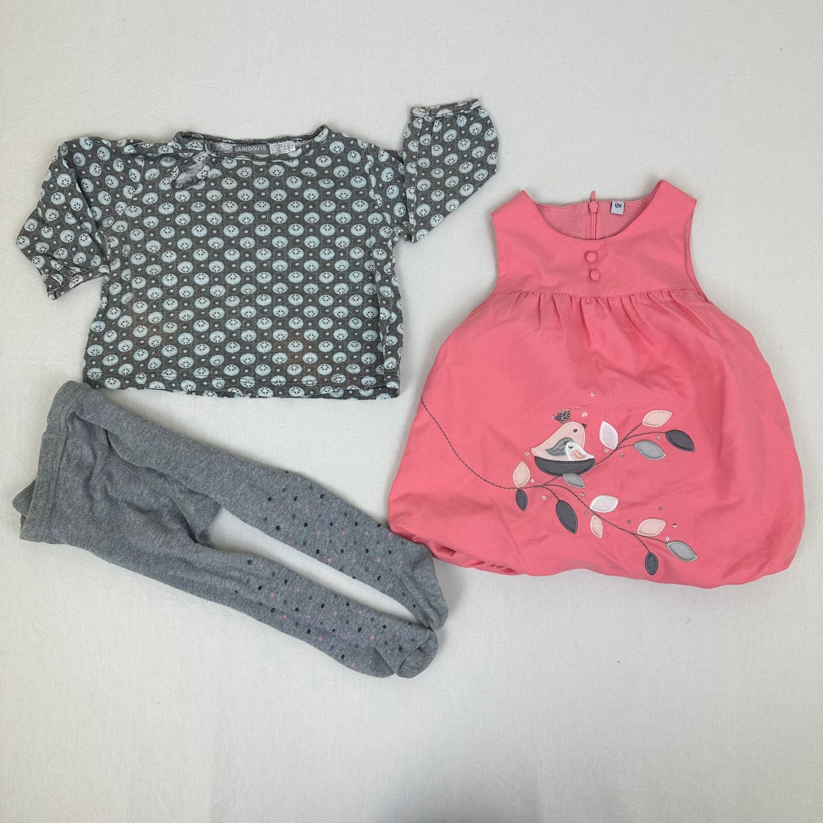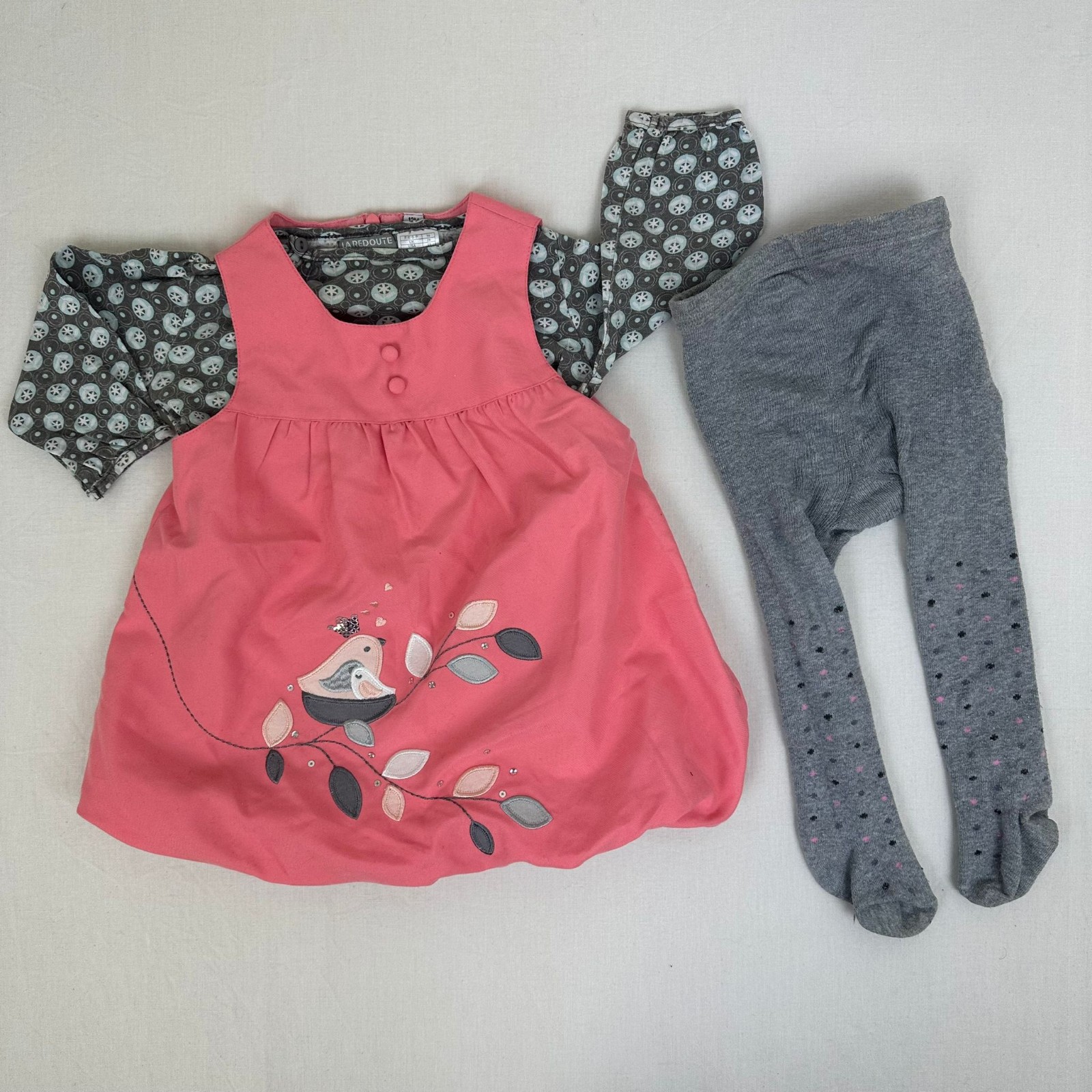 Autres commentaires : T-shirt manches longues gris La redoute avec des boules bleu clair et une fermeture par boutons. Robe rose sans manches et sans marques avec motif un oiseau . Collant gris sans marque avec taille élastiquée et quelques bouloches d’usage.