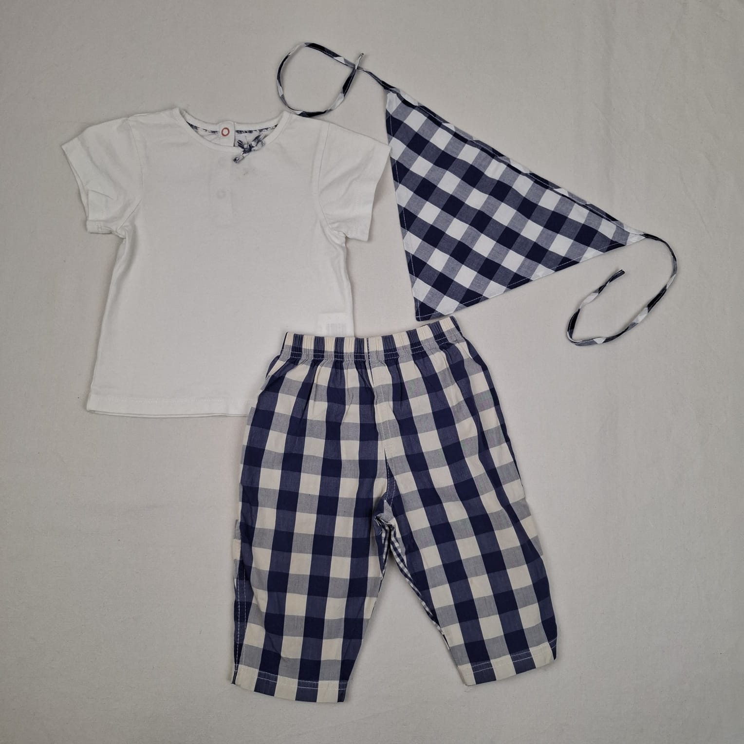 Autres commentaires : Ensemble 3 pièce : T-shirt blanc, Cadet roussel, Petit défault petite tâche à l’avant en dessous du col, col rond avec noeud papillon pour décorer, boutons pressiosn à l’arrière pour ouvrir le col. Foular à carreaux bleu et blanc. Pantalon à carreaux bleu et blanc, Absorba, avec un étiquette absorba attaché à l’arriere du pantalon, motifs difféents à l’arrière, avec des carreaux beaucoups plus petits
