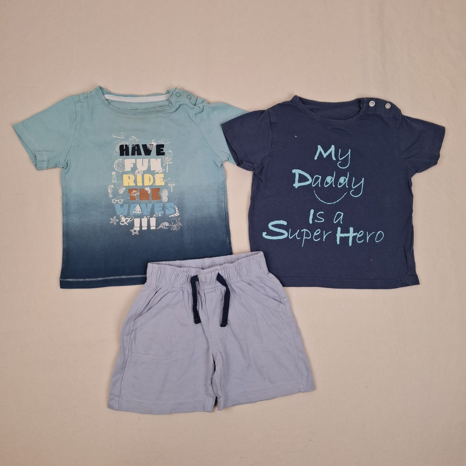 Autres commentaires : Lot de 2 T-shirts a col rond, boutons a coté du col pour ouvrir celui c, et d’un short: – T-shirt bleu, bébé rêve, inscription « HAVEC FUN RIDE THE WAVE!!! » à l’avant du vêtement. – T-shirt bleu foncé, inscription « My daddy is a super Hero ». – Short bleu tres clari, taille élastiqué