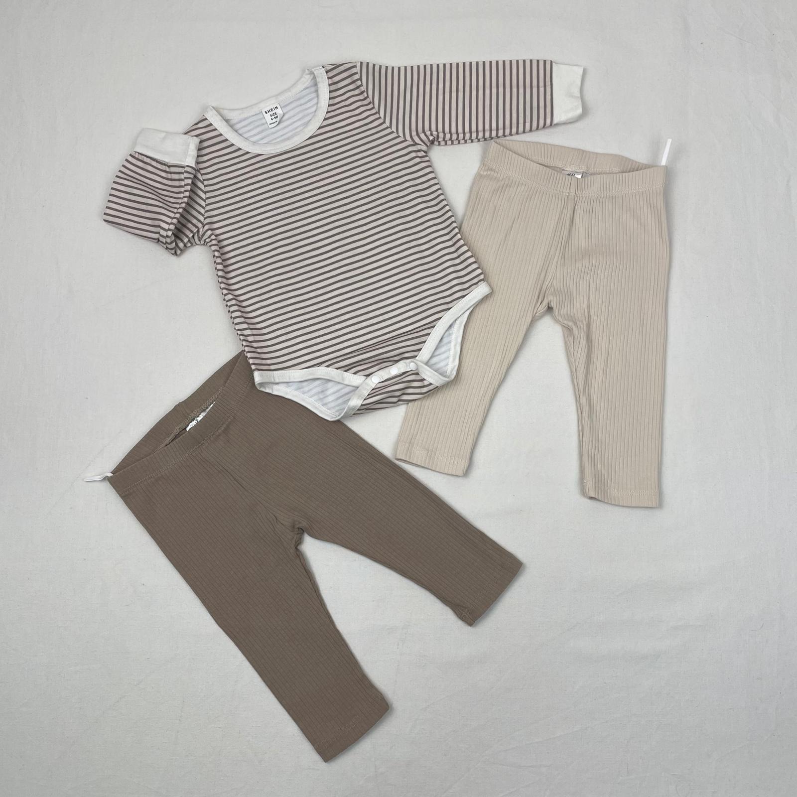 Autres commentaires : Ensemble 3 pièces : – 2 leggings côtelés H&M, 95% coton et 5% élasthanne dont un marron clair et un beige. – Body manches longues Shein, beige à rayures marron, col rond et poignets écrus.