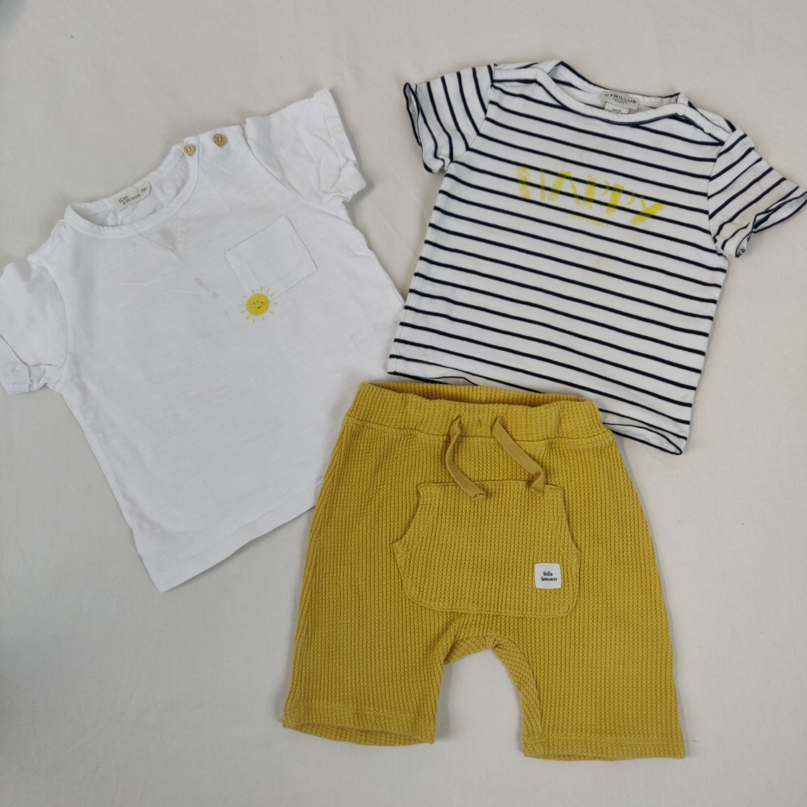 Autres commentaires : Ensemble 3 pièces. Un t-shirt LC Kids à manches courtes – blanc. Une pochette centrale. Ouverture latérale à 2 boutons. Motif central soleil. Quelques tâches marrons au devant. Un t-shirt Cyrillus à manches courtes blanc rayé bleu. Ouverture latérale à 2 pressions. Inscription centrale jaune « Happy ». Quelques tâches orangées au devant. Un pantalon Name it – jaune. Taille ajustable et élastique avec cordon interne jaune. Une pochette centrale. Ecusson blanc avec inscription Hello summer. Niveau réduit de fraise à myrtille.