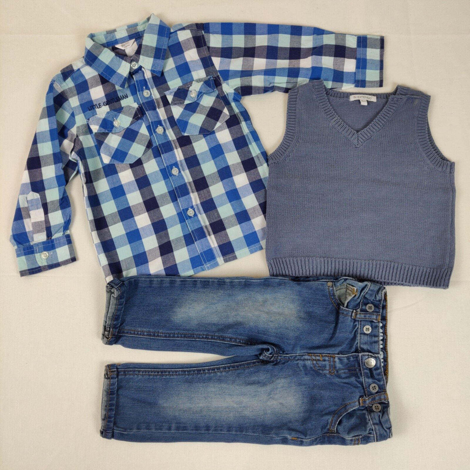 Autres commentaires : Ensemble 3 pièces. Une chemise sans marque à manches longues à carreaux blancs, bleus, bleu marine et verts. Inscription centrale « Little gentleman ». 2 pochettes centrales à rabat. Ouverture centrale à boutons nacrés. Ouverture aux manches à un bouton nacré. Un pull sans manche In Extenso en fines mailles – bleu-gris. Col V. Un jean Gemo – bleu. Taille ajustable. Ouverture centrale à un bouton. 2 poches latérales et 2 poches arrières. Chevilles retroussées. Passants pour une ceinture. Traces d’usure au niveau des jambes.