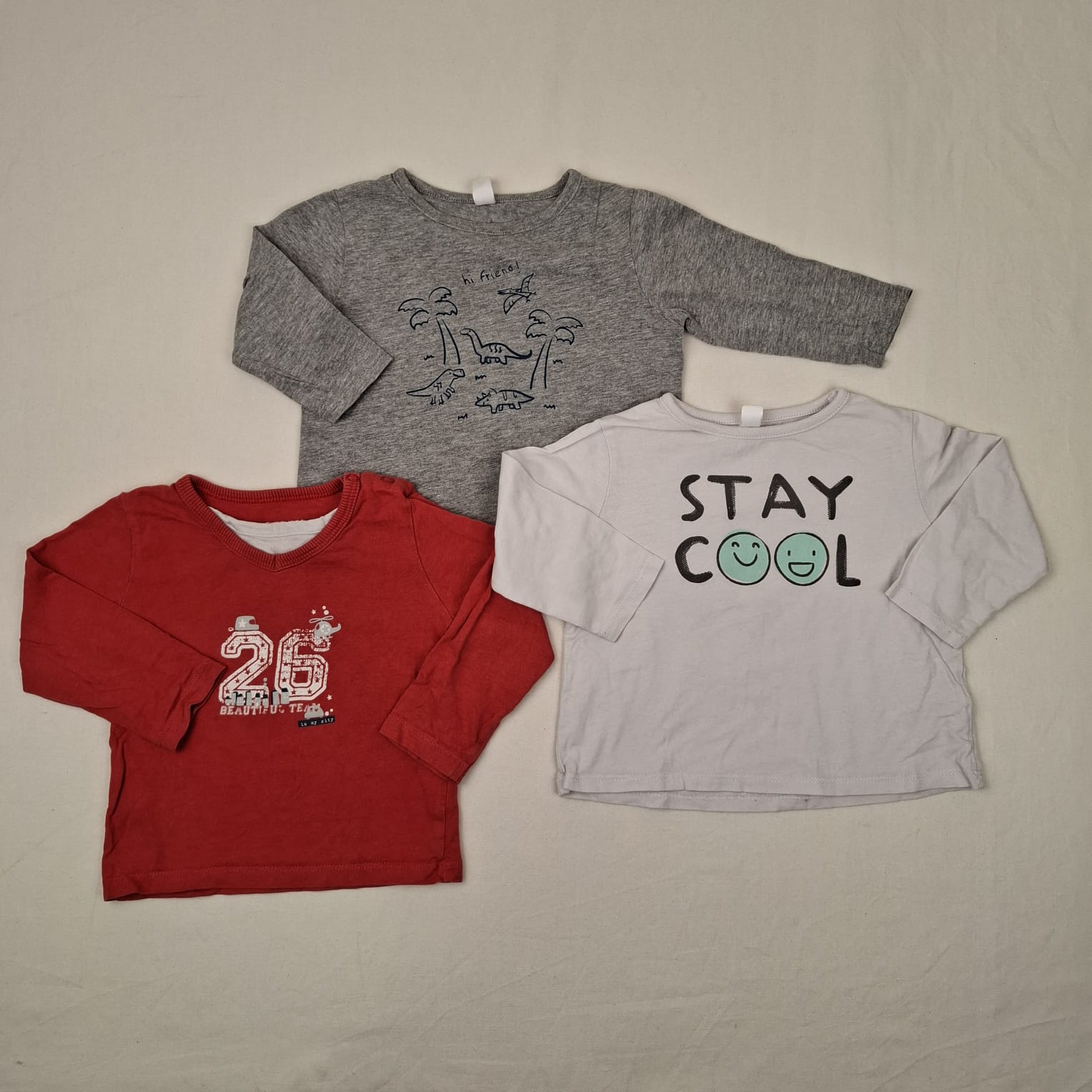 Autres commentaires : Lot de 3 t-shirts manches longues dont – 1 gris Tex, col arrondi, motif dinosaures dessinés en bleu pétrole, inscription « hi friend », 85% coton et 15% viscose – 1 blanc cassé Tex, 100% coton, col arrondi, inscription « Stay cool » avec des smileys verts à la place des lettres O. – 1 rouge In Extenso, col V avec plastron blanc cassé au niveau du col, inscription en blanc « 26 »  » Beautiful team in my city », motifs petits véhicules gris clairs, 100% coton.
