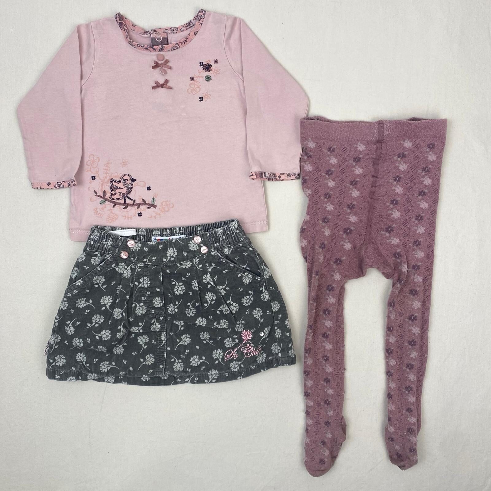 Autres commentaires : Ensemble 3 pièces : – Jupe grise Teddylu, velours cotelé, taille élastiquée. – T-shirt rose à manches longues Sergent Major avec des motifs de fleurs brodés, col rond, fermeture par boutons pression au dos. – Paire de collants rose H&M avec des motifs de fleurs, taille élastiquée.