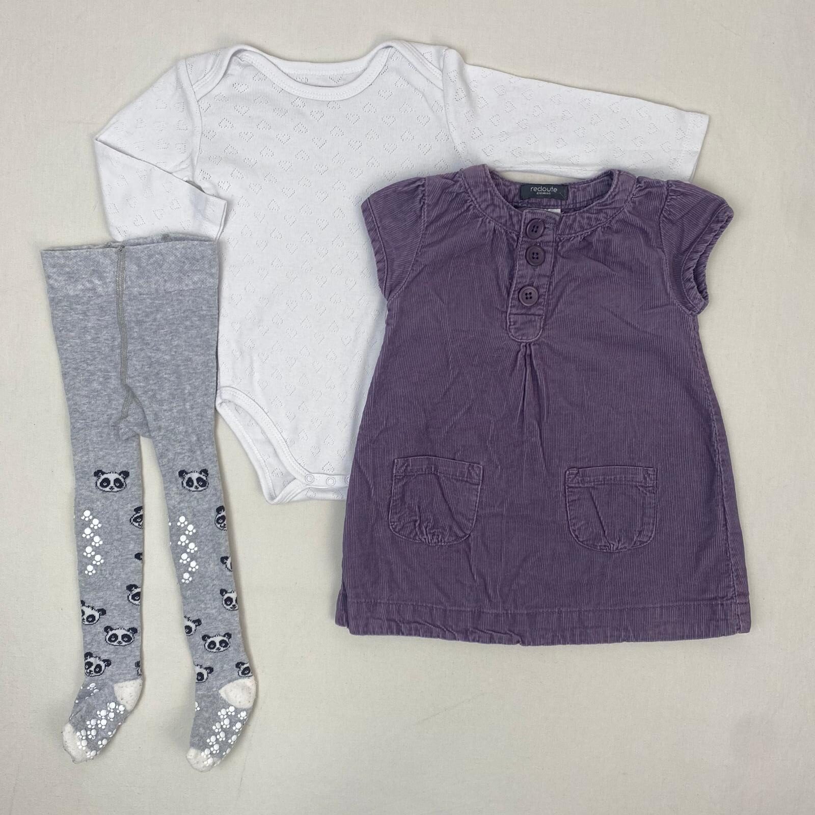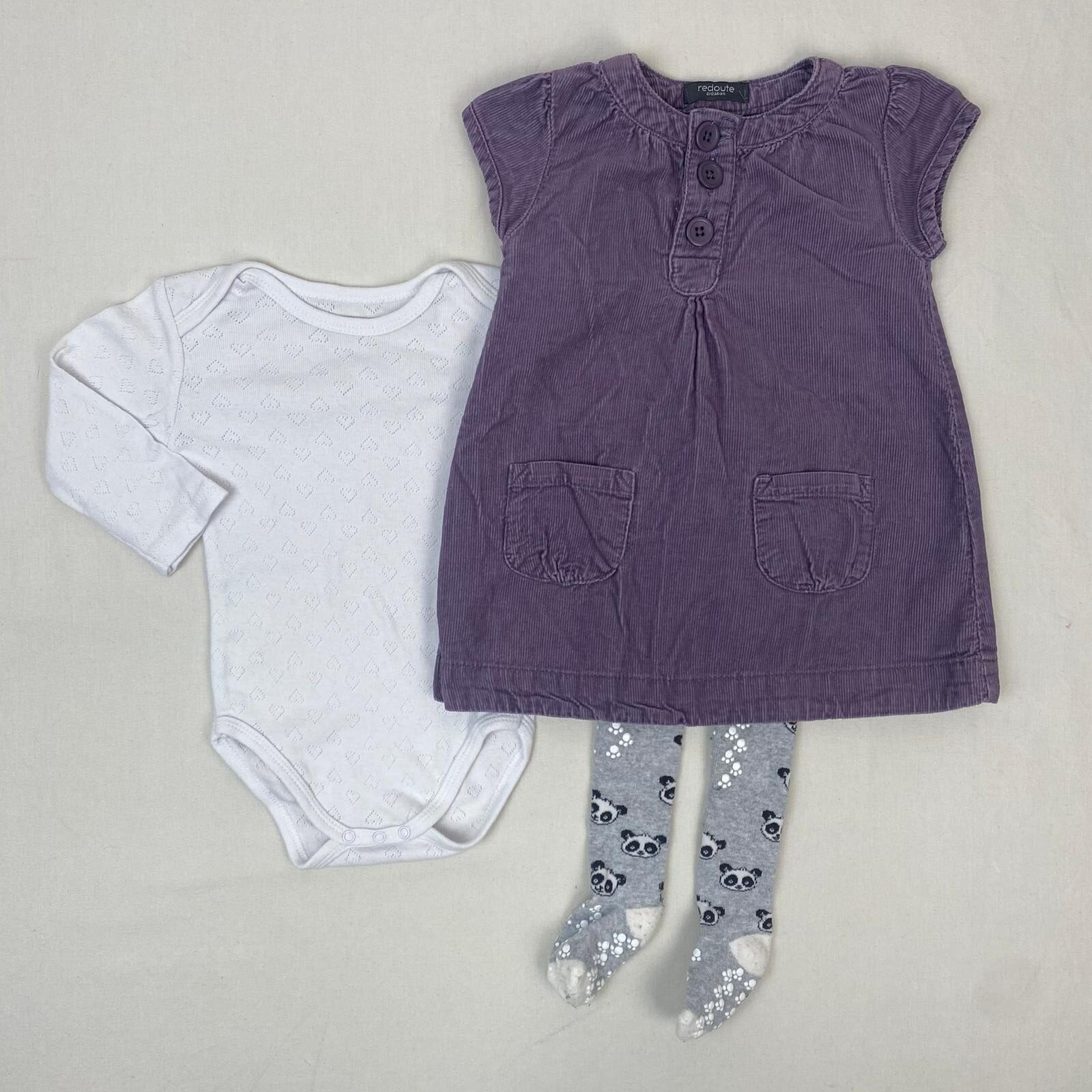 Autres commentaires : Ensemble 3 pièces : – Robe à manches courtes en velours cotelé violet, fermeture par boutons à l’avant. – Body blanc sans marque, ajouré avec des motifs de coeur, fermeture par boutons pression. – Paire de collants Lupilu gris avec des motifs de pandas, 17% polyamide et 2% élasthanne.
